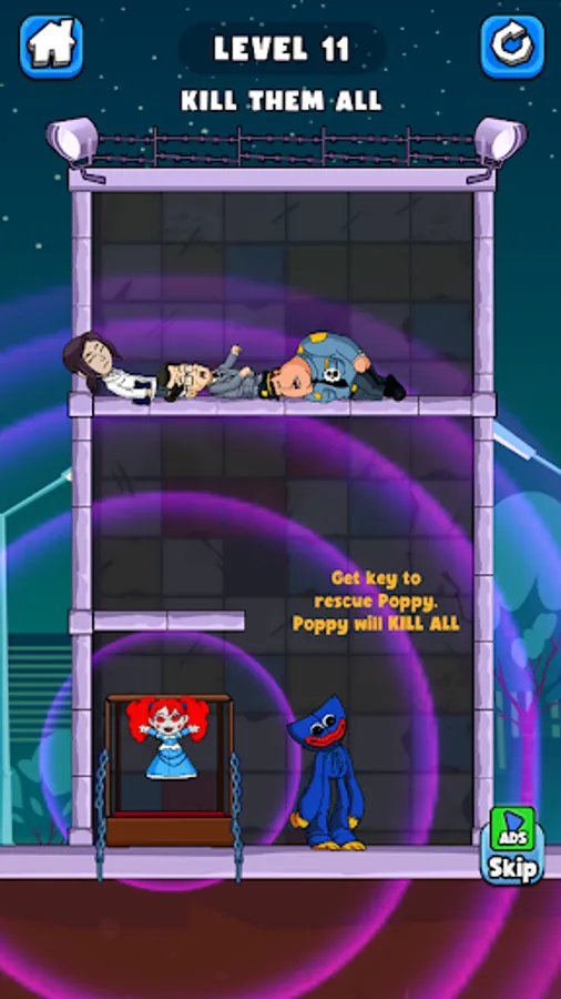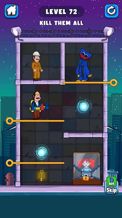 â—¾ Pull the pin in the right order to defeat those then get the key to rescue Poppy who is locked in the glass box. Just one small mistake can make monster lose their lives.