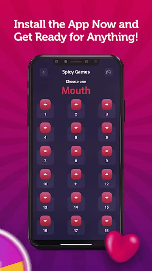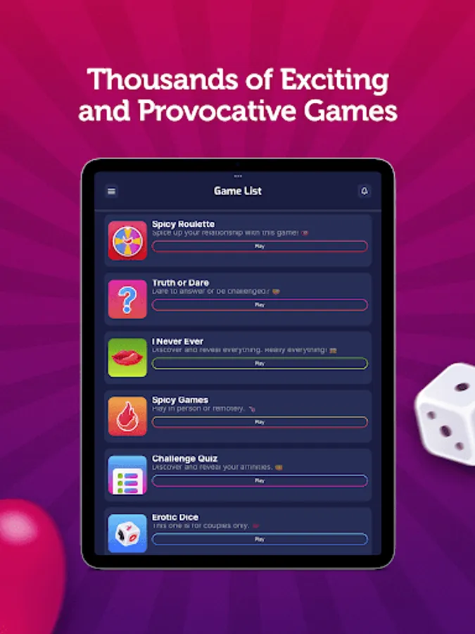 The game contains 6 Different Categories (Spicy Roulette; Truth or Dare; I Never; Spicy Games; Challenging Quiz and Erotic Craps), there are hundreds of light, daring and extreme games.