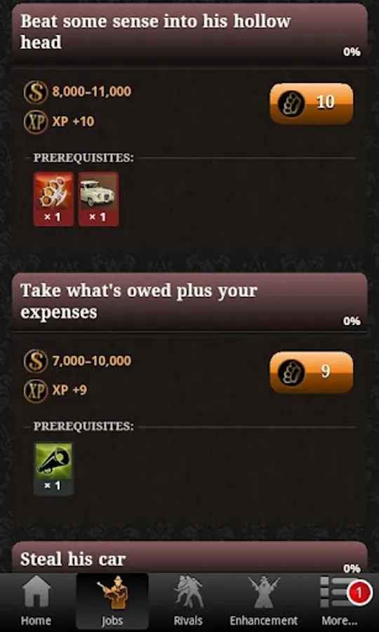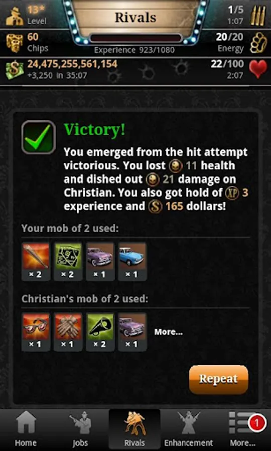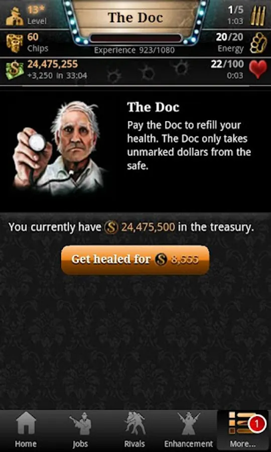 In Mafia Game you get to experience exciting adventure in the swinging 50s, as you climb the ladder rising from small time crook to Mafia boss. Collect experience and train your fighting skills in this role playing game in order to take out your unscrupulous rivals. You can form your own mob with friends to become stronger and to climb the high score lists.
