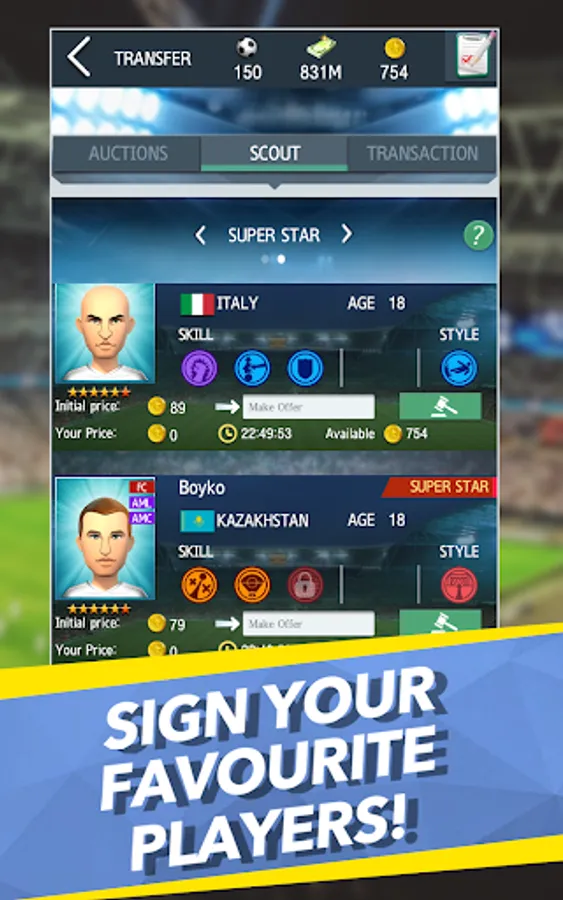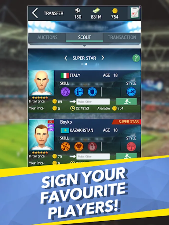 Find the players that fit your team's needs. Bid against other managers to win the promising boy of the market, recruit superstars with your agent, or use scouts to find young players with hopes of becoming tomorrow legends.