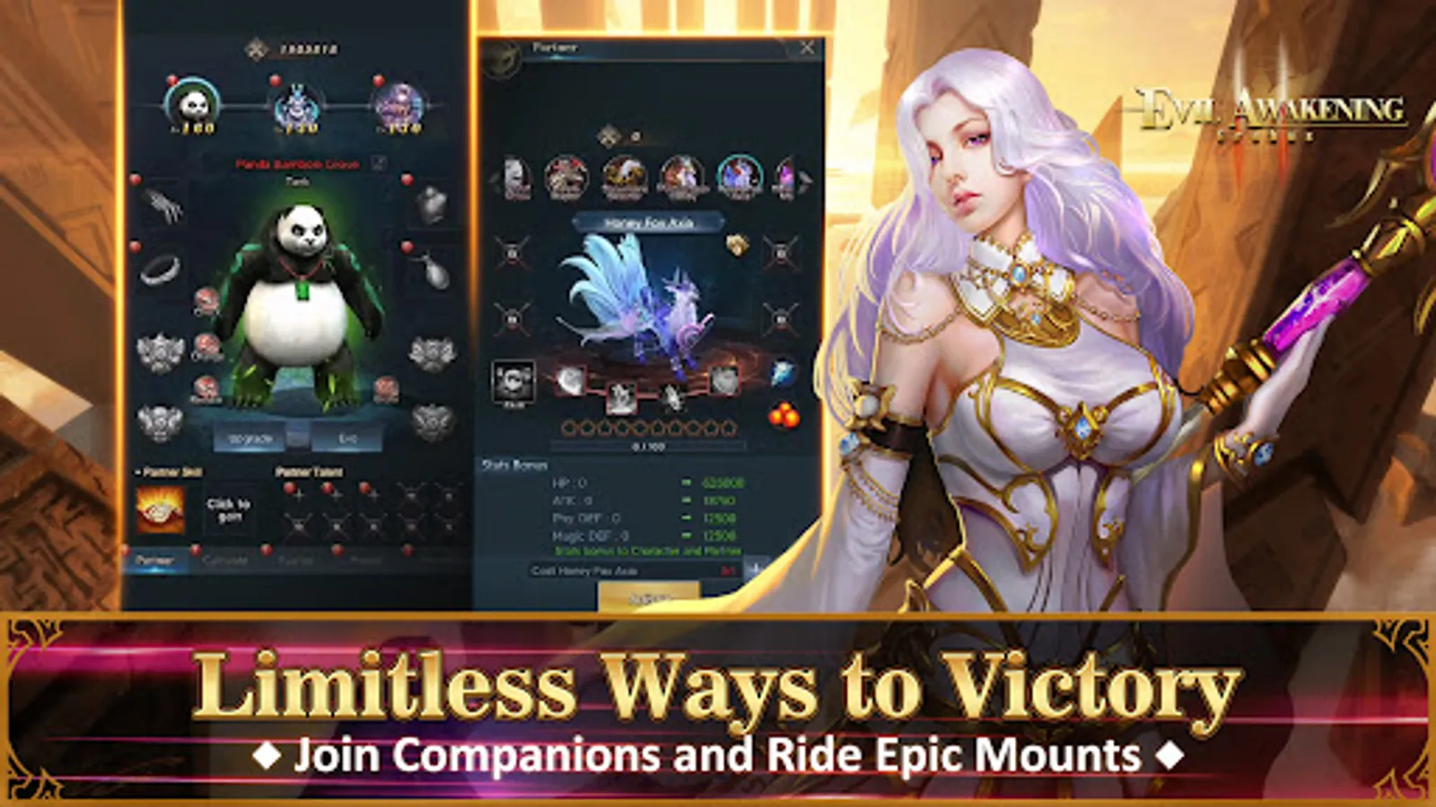 Enjoy epic visuals with 2.5D and 3D rendered artwork that will immerse you into Evil Awakening II. Summon mighty partners and mystical mounts to fight by your side on dungeon raids - gather your allies to explore menacing dungeons and discover rare loot.