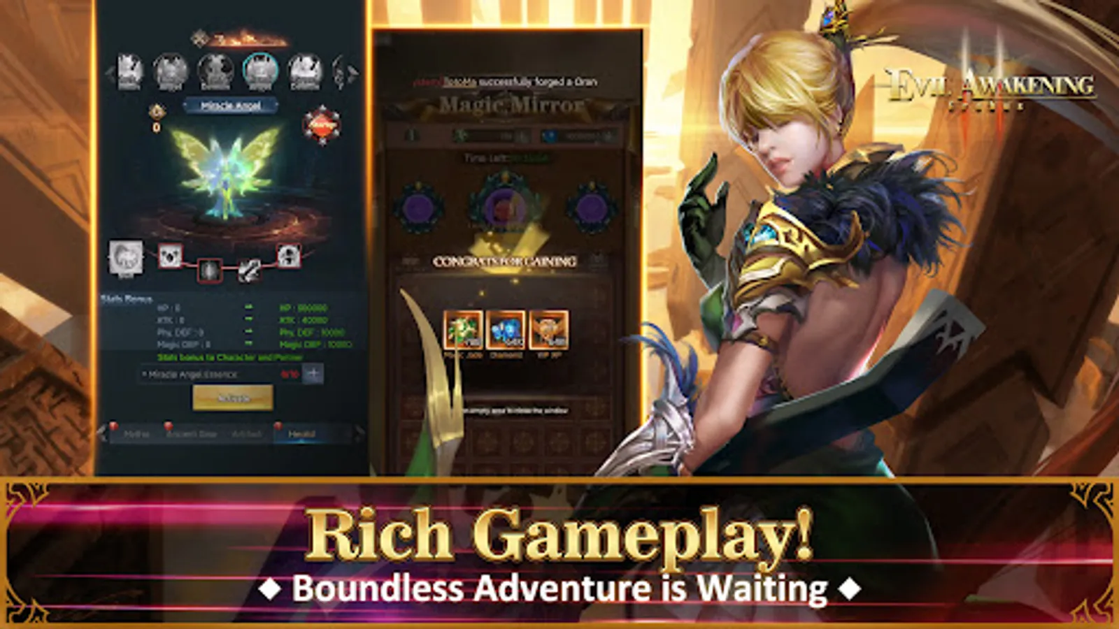 Evil Awakening II: Erebus is ushering in the next era of Evil Awakening franchise with high quality mobile game experience, featuring authentic Evil Awakening style. Evil Awakening II: Erebus, a superior idle MMORPG experience with endless evil to defeat, countless abilities to master, nightmarish dungeons, and legendary loot. This classic RPG game offers you a pleasant and fulfilling experience of incorporating a variety of game elements into the battle process, creating an in-depth character development system, and giving you a vast area of the outer city to explore freely. Fighting the abyss monsters and bosses to protect the world from chaos, all while facing other players. You can improve yourself in RPG adventures, including battles, wild fighting, occupations and plundering. You can also build your own league, establish a base and ally yourself with other players worldwide. Evil Awakening II: Erebus even provides an auto-fight system. All you need to do is start the game and wait, watch the battle proceed, harvest the offline loot, experience, and fulfillment!