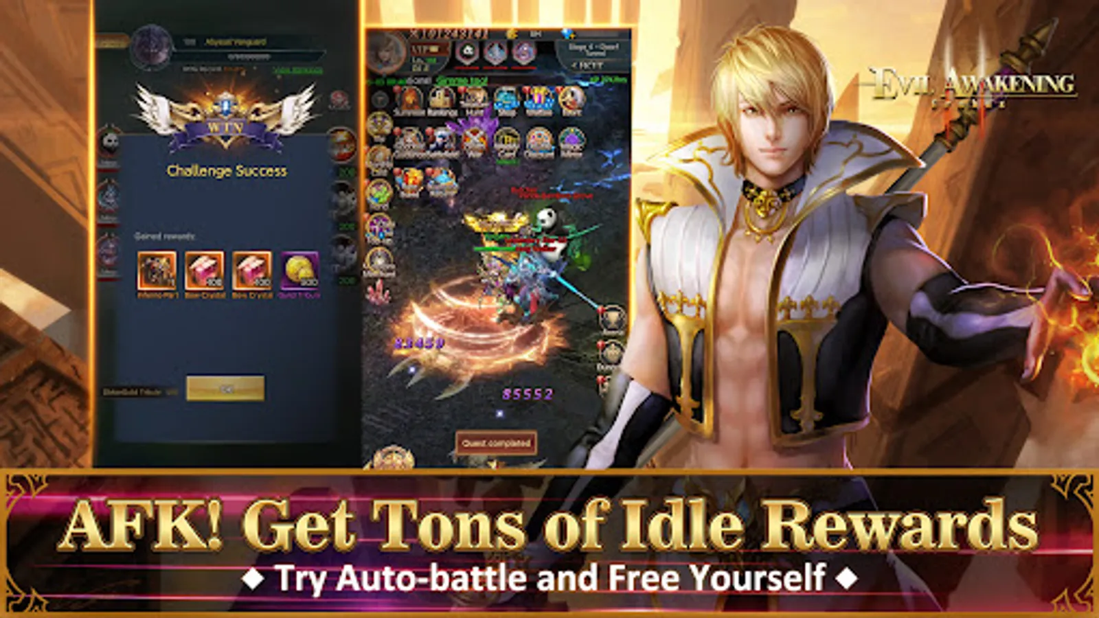 Idle anytime in Evil Awakening II: Erebus, play anywhere for FREE. Heroes will fight automatically when you are AFK. Just wait and relax and you'll be rewarded with a huge amount of treasure.