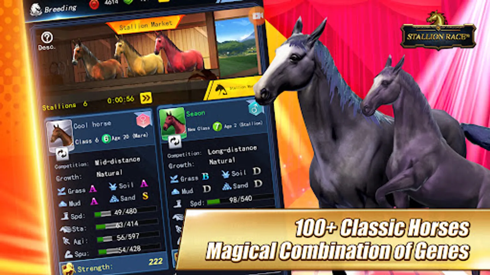 Stallion Race features over 100 classic racehorses. Breed and manage all kinds of horses, from the Arabian horse to the Oldenburg and many other thoroughbred horses. Combine the genes wisely, you will need to choose the best stallion and mare to breed the legendary foal. You'll be able to improve the horse's speed, stamina, agility and spurt through training. Grooming is also an important part to improve your horse’s condition before the race. Improve the stallions' track performance in training courses and make them become a star!