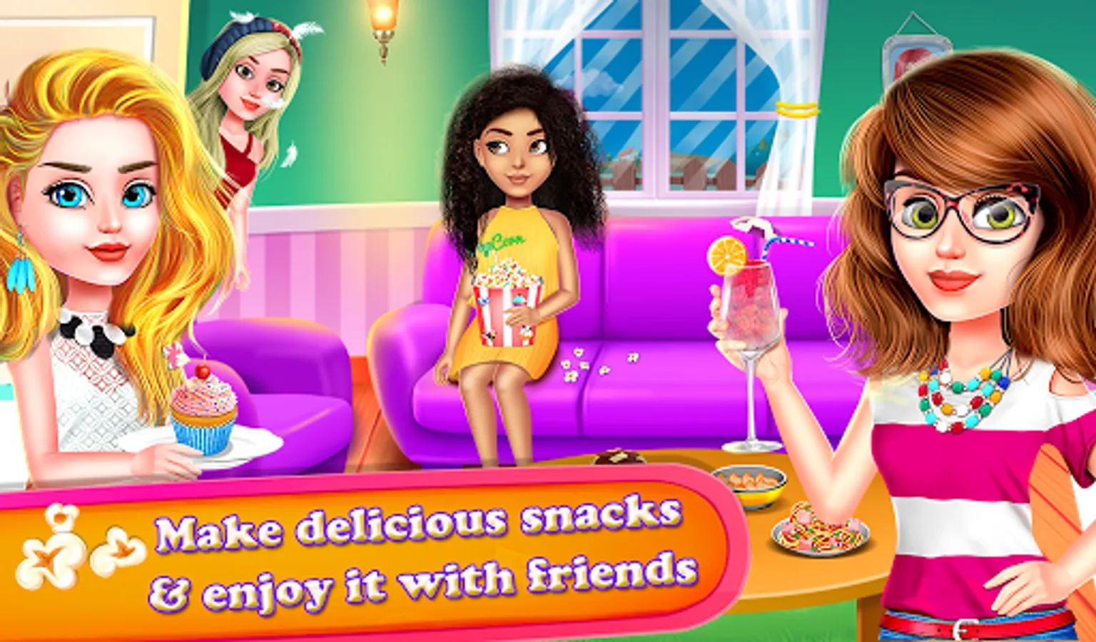 After this PJ party starts, these pajama girls go crazy. Organizer girl has arranged some girl's favorite fun overnight activities like Nail Art, Hair Do Design and Pillow Making in this BFF games. These sleepover activities will eat sometime in the PJ party and they will have also a good time in this night party. Then crazy BFF girls started pillow fighting which will give you so much enjoyment. Snacks will be made in the cooking game by them like Popcorns, Cup Cake, and mocktail. Then these partying girls go nuts and start bedroom jump with so much fun in this girl's night out. Then they start pillow fighting again. After that, they go to the DJ room and have a crazy dance. Lastly, they painted a girl's face. Selfies are taken in the memory of this Crazy PJ party. You need to take part in each & every PJ night party activities they are going to perform & have lots of fun in this PJ night party game with your friends and family.