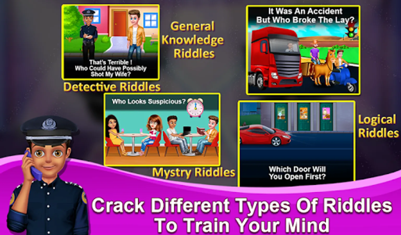 Do you wanted to be a detective and solve impossible cases??? Then this game is made for you. It's full of tricky riddles which will make your mind go crazy. Prove yourself a genius by taking part in this unique contest. In this game, you will be a contestant of the famous contest "Who Is Thief & Killer Mystery Riddles". You need to crack so many riddles to win the contest. Killer and Thief mysteries will definitely be going to trick your mind. So what are you waiting for? Install this game and test your IQ by solving multiple riddles. Don't forget to share it with your friends and family.