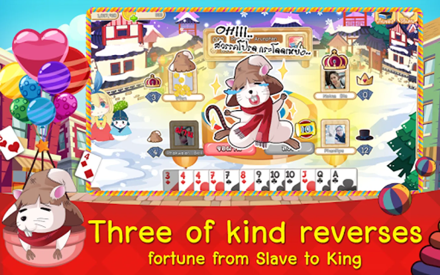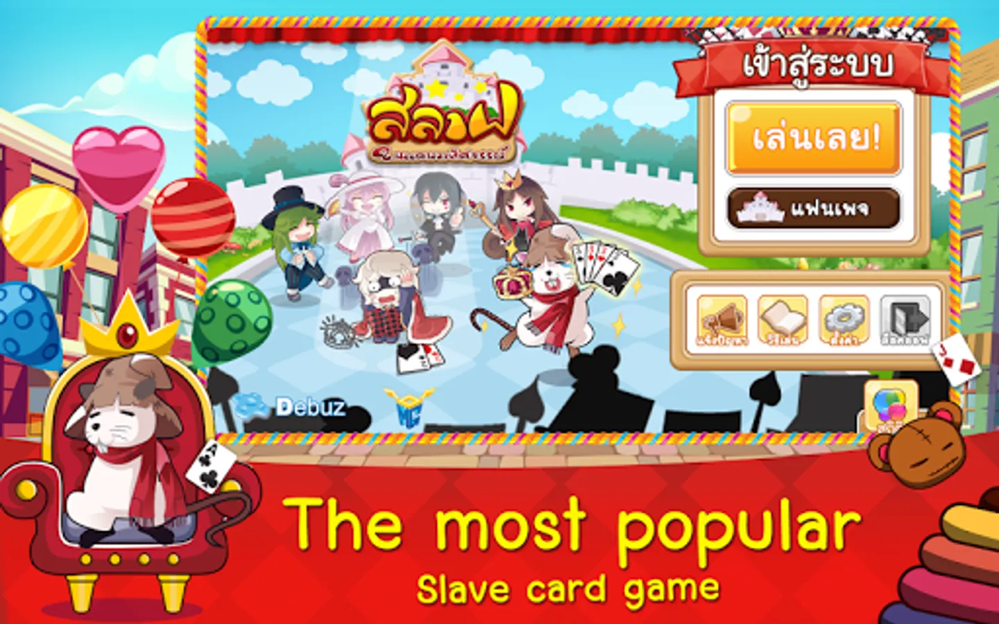 Slave is Online casino game, We are the Top Developer from Thailand who published "Dummy" the top of Thai free card game. Now, we're proud to present the fantasy card game call "Slave". Slave is a strategy card game similar to the game Big Two, President, Deuces, Winner and Daifugō. This game consists of a king (person who won) and a slave (person who lost).