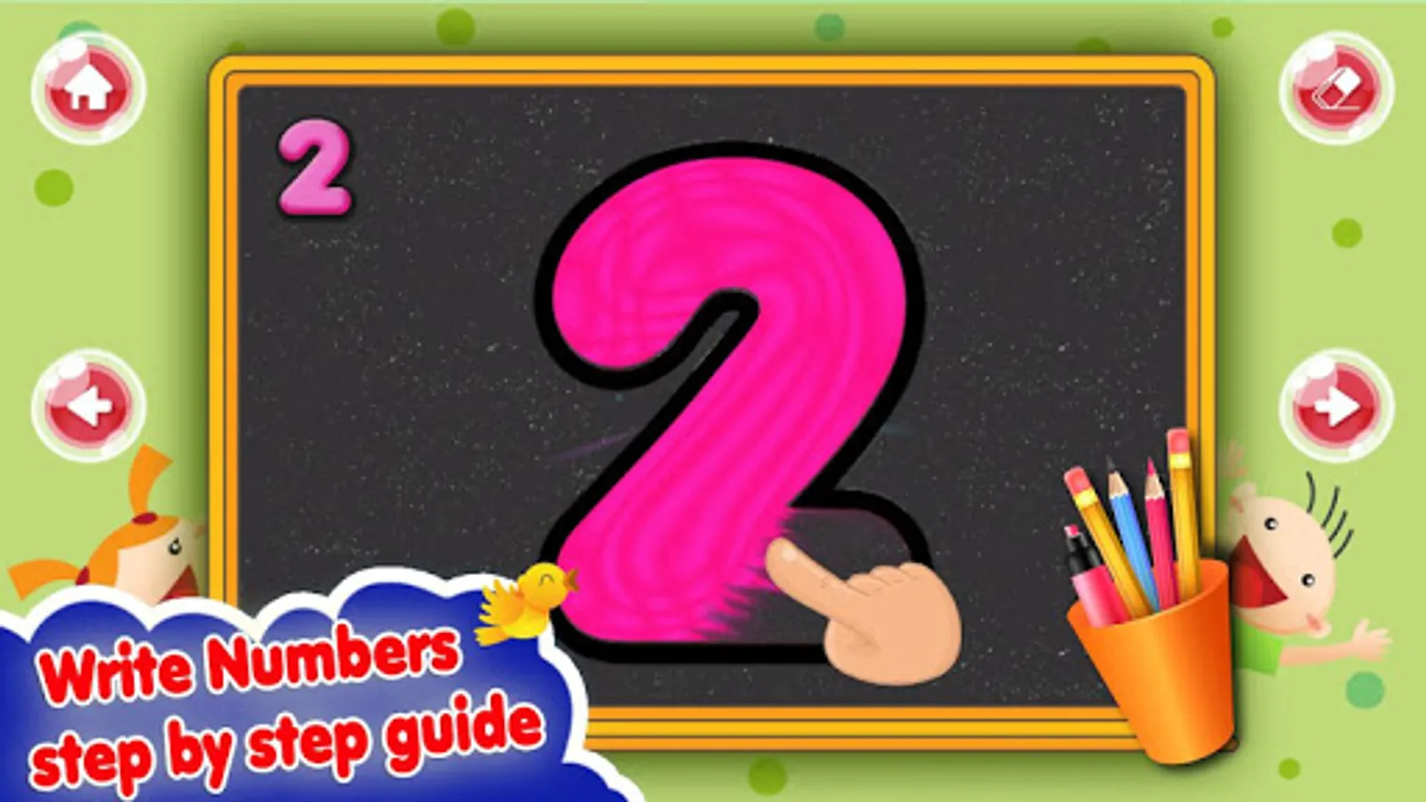 this game is specially released for 4,5 years old kindergartner ,toddler or preschool age child they can learn English letter,numbers step by step just by following the arrow line with their finger.kids learn the numbers with fun flash card ,count and hear the words.