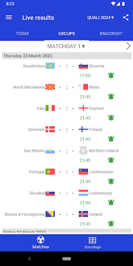 Results for EuroCup Football 2024 is the application that will help you to follow live results of European Football Championship 2024 and qualifiers, even you do not have possibility to watch TV or live stream. The application contains a calendar, a schedule of all the matches, top scorers and live scores for Euro 2024. With the application you will not miss a goal or begin of a match, because it will send you a push-notifications. You can select favorite matches and receive notifications only for them.