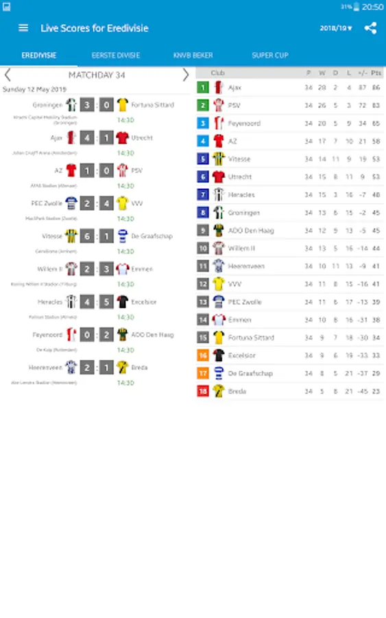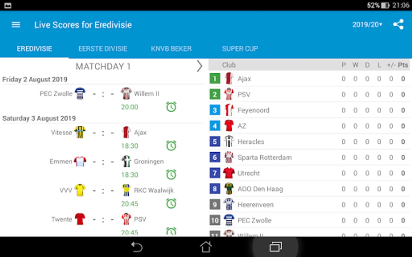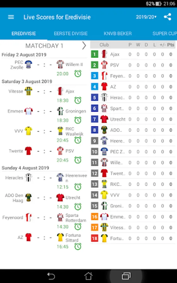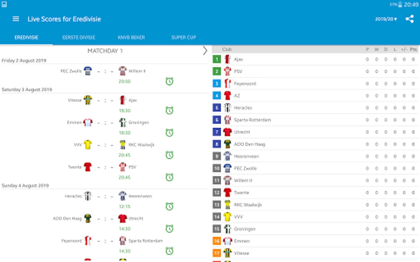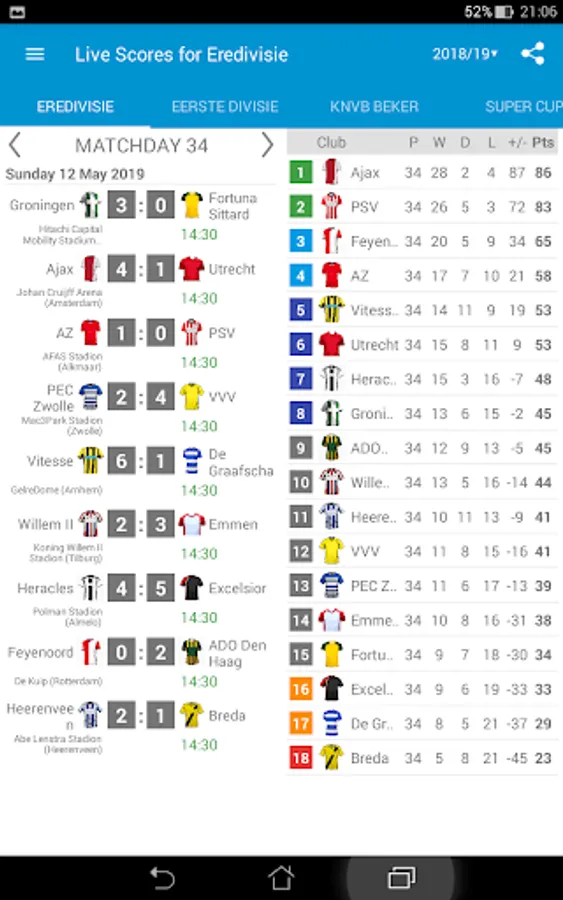 Live Scores for Eredivisie 2023/2024 is the app that will allow you to follow the matches of Football Championship in Netherlands, even you do not have possibility to watch TV or live stream. It includes a calendar, schedule of matches, standings and live scores of Eredivisie Eerste Divisie, KNVB Beker, Super Beker. With the application you will not miss a goal or begin of a match, because it will send you a push-notifications. You can select favorite matches and receive notifications only for them. In Eredivisie season 2023/24 play the teams: Feyenoord, Ajax, PSV, Heerenveen, AZ Alkmaar, Fortuna Sittard, Vitesse, Utrecht, Heracles, FC Volendam, G.A. Eagles, Nijmegen, Twente, Almere City, Excelsior, Zwolle, Sparta Rotterdam and Waalwijk.