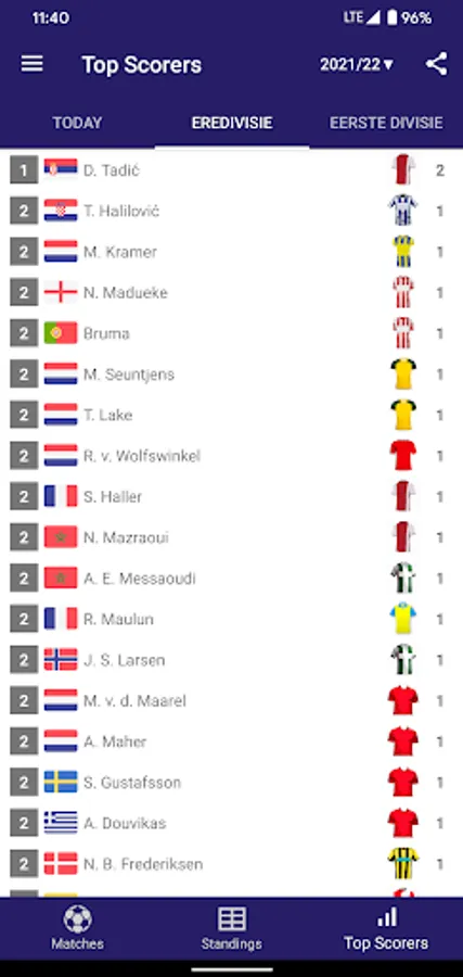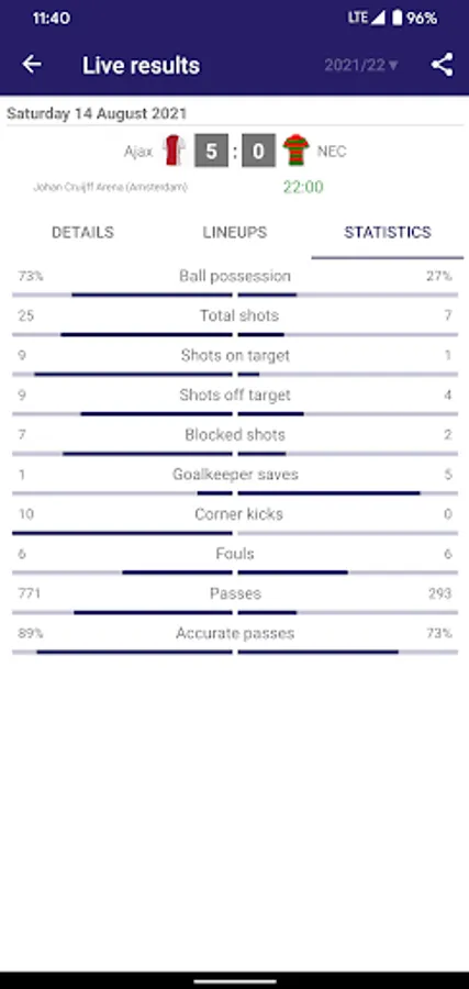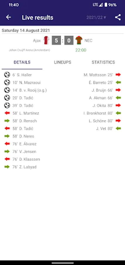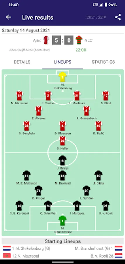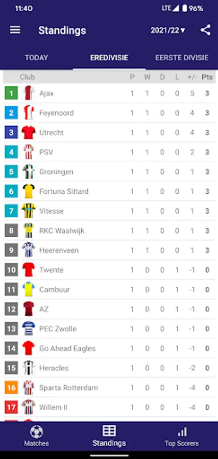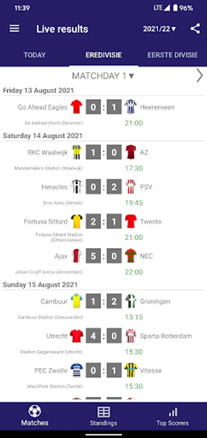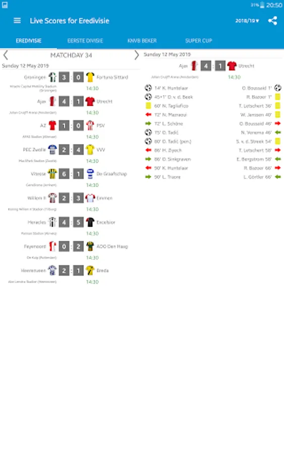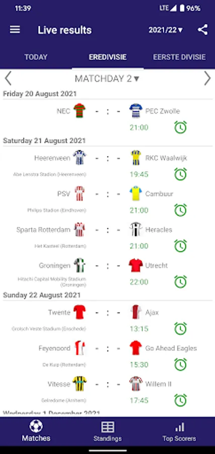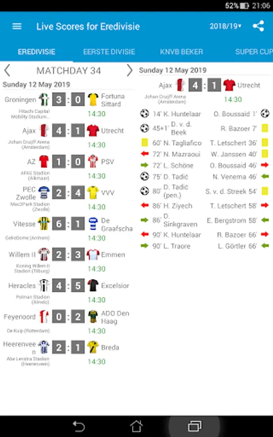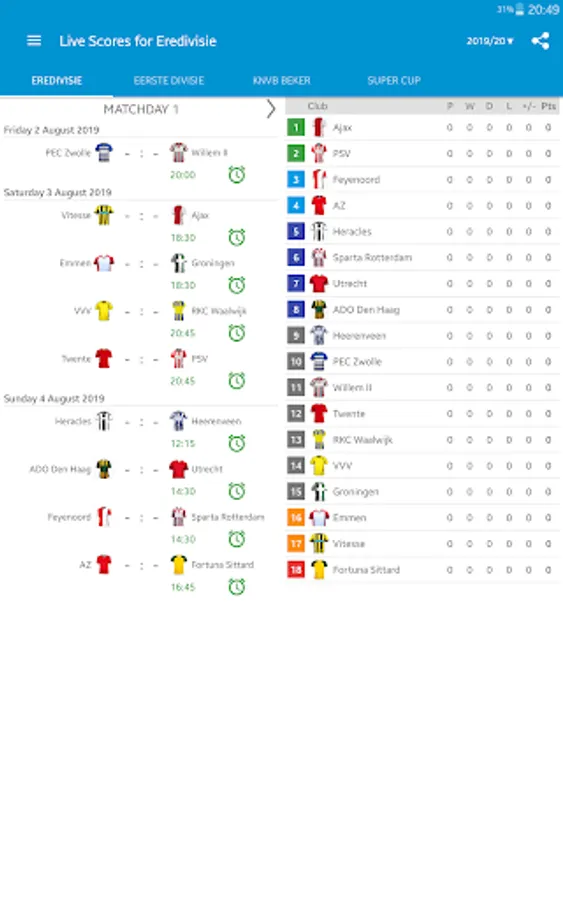 Live Scores for Eredivisie 2023/2024 is the app that will allow you to follow the matches of Football Championship in Netherlands, even you do not have possibility to watch TV or live stream. It includes a calendar, schedule of matches, standings and live scores of Eredivisie Eerste Divisie, KNVB Beker, Super Beker. With the application you will not miss a goal or begin of a match, because it will send you a push-notifications. You can select favorite matches and receive notifications only for them. In Eredivisie season 2023/24 play the teams: Feyenoord, Ajax, PSV, Heerenveen, AZ Alkmaar, Fortuna Sittard, Vitesse, Utrecht, Heracles, FC Volendam, G.A. Eagles, Nijmegen, Twente, Almere City, Excelsior, Zwolle, Sparta Rotterdam and Waalwijk.