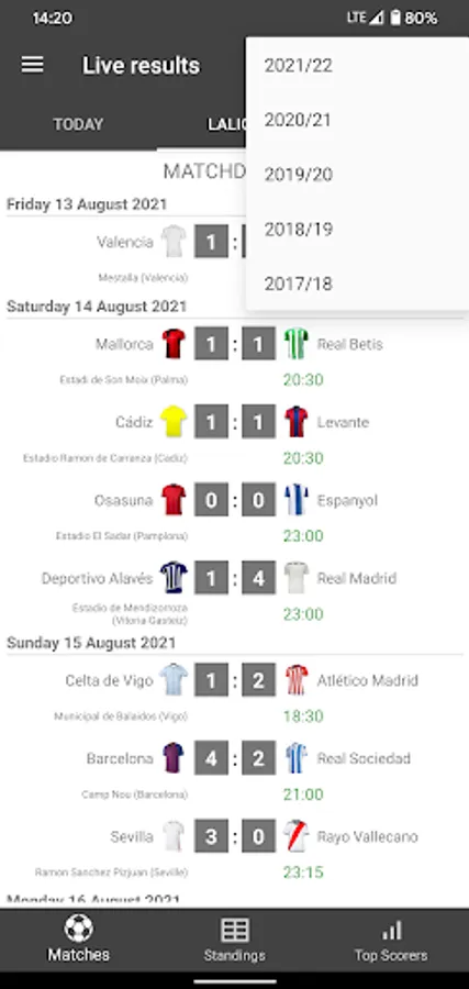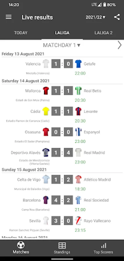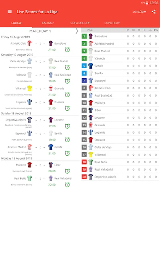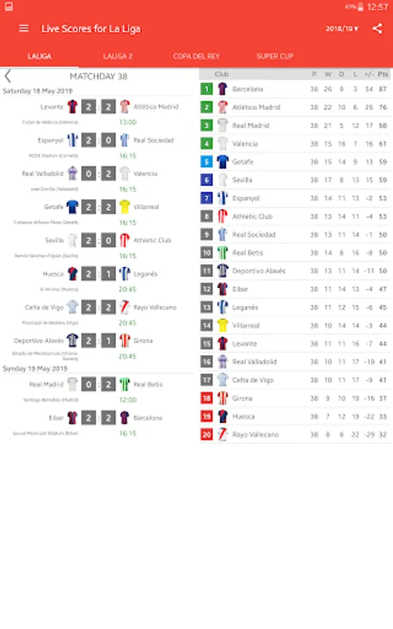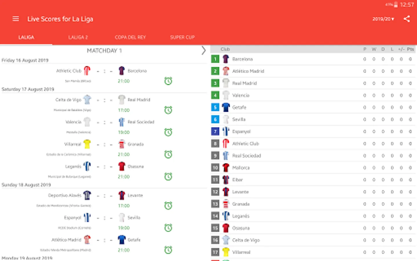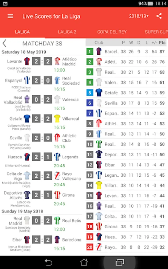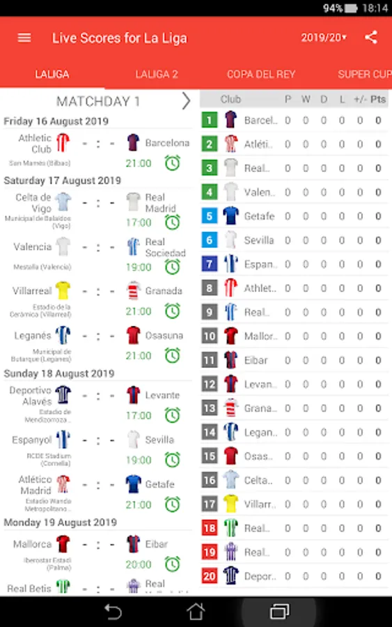 Live Scores for La Liga EA Sports 2023/2024 is the app that will allow you to follow the matches of Football Championship in Spain, even you do not have possibility to watch TV or live stream. It includes a calendar, schedule of matches, standings and scores of LaLiga EA Sports, LaLiga Hypermotion, Copa del Rey and Super Cup. With the application you will not miss a goal or begin of a match, because it will send you a push-notifications. You can select favorite matches and receive notifications only for them. In LaLiga season 2023/24 play the teams: FC Barcelona, Real Madrid, Sevilla FC, Mallorca, Almeria, Osasuna, Las Palmas, Rayo Vallecano, Real Sociedad, Cadiz CF, Girona, Atlético de Madrid, Villarreal CF, Alaves, Getafe CF, Granada CF, Real Betis, RC Celta, Valencia CF and Athletic Club.
