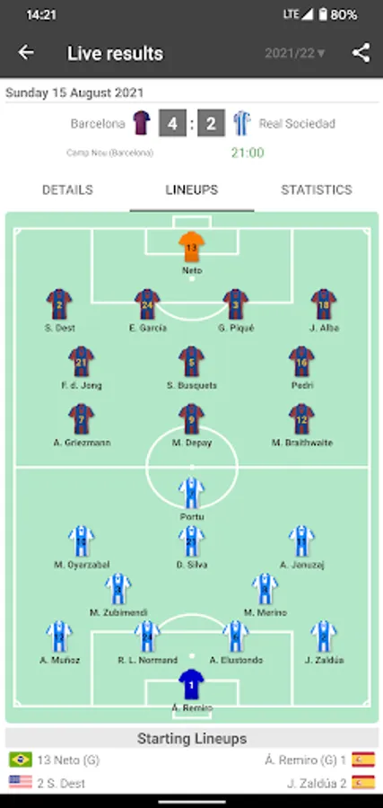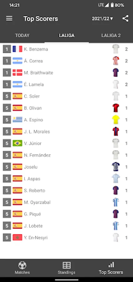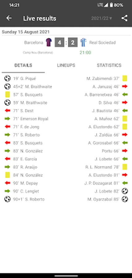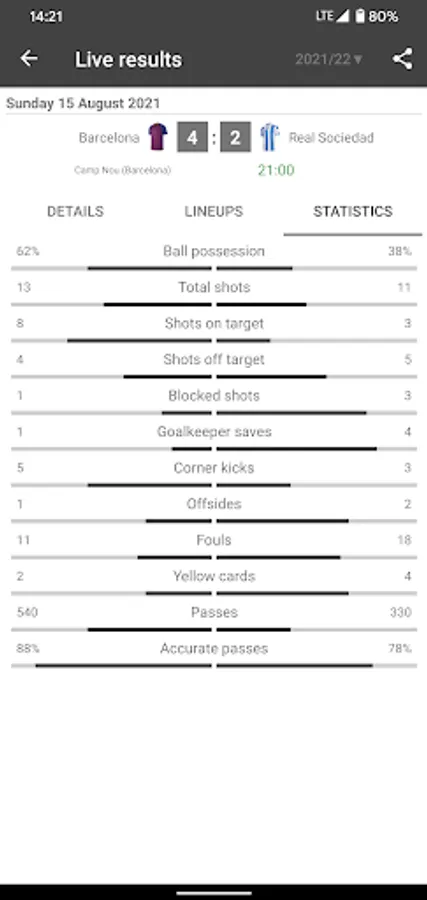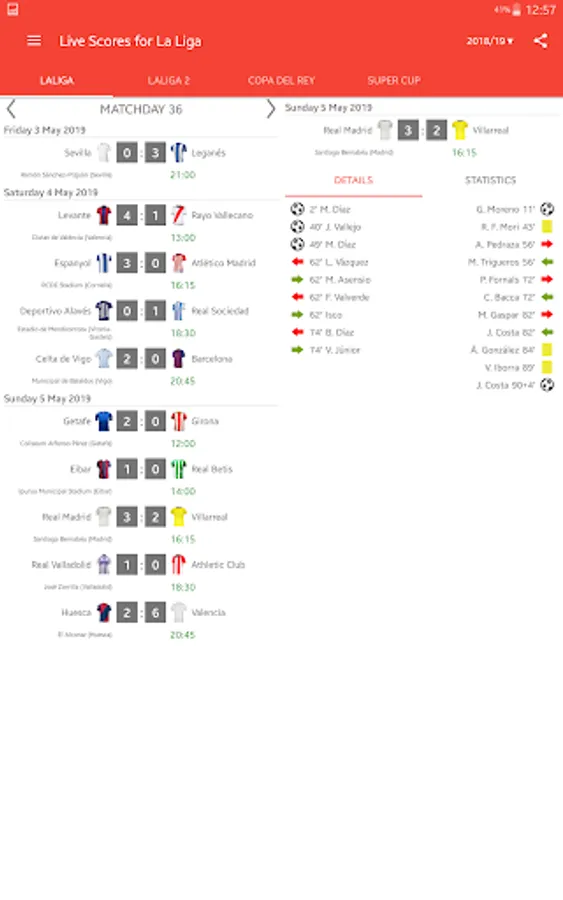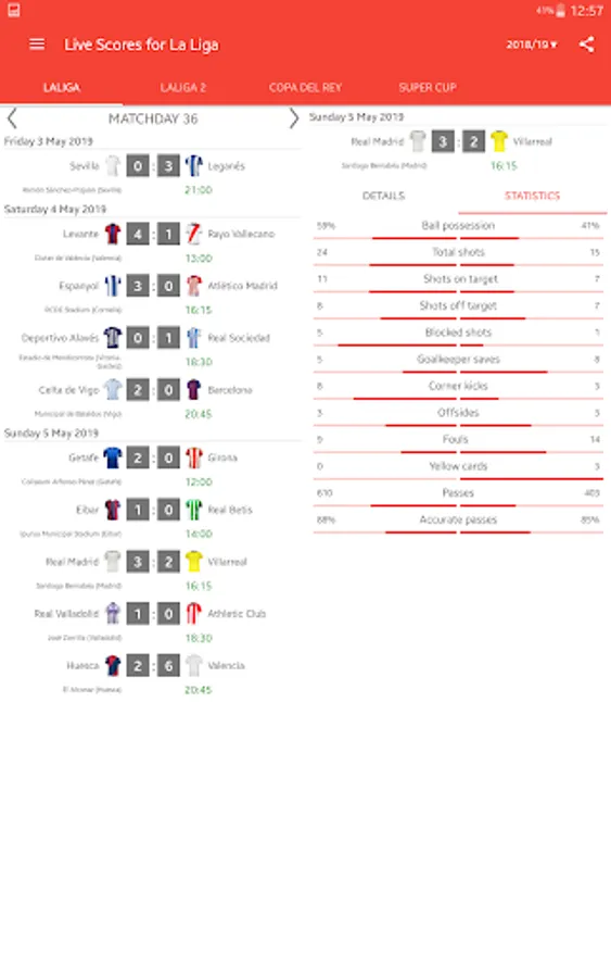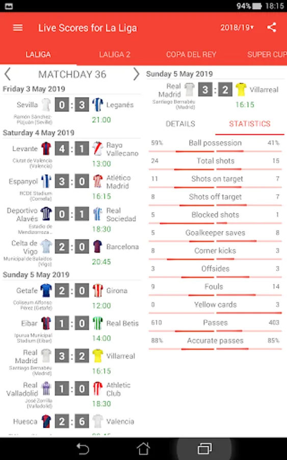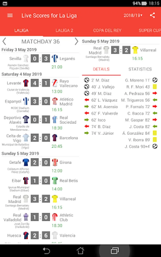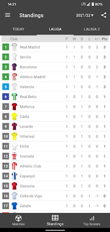 Live Scores for La Liga EA Sports 2023/2024 is the app that will allow you to follow the matches of Football Championship in Spain, even you do not have possibility to watch TV or live stream. It includes a calendar, schedule of matches, standings and scores of LaLiga EA Sports, LaLiga Hypermotion, Copa del Rey and Super Cup. With the application you will not miss a goal or begin of a match, because it will send you a push-notifications. You can select favorite matches and receive notifications only for them. In LaLiga season 2023/24 play the teams: FC Barcelona, Real Madrid, Sevilla FC, Mallorca, Almeria, Osasuna, Las Palmas, Rayo Vallecano, Real Sociedad, Cadiz CF, Girona, Atlético de Madrid, Villarreal CF, Alaves, Getafe CF, Granada CF, Real Betis, RC Celta, Valencia CF and Athletic Club.