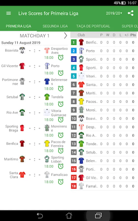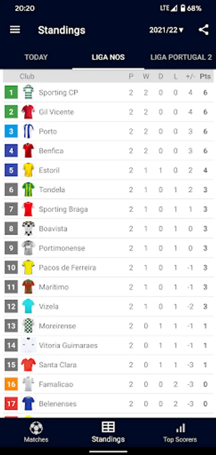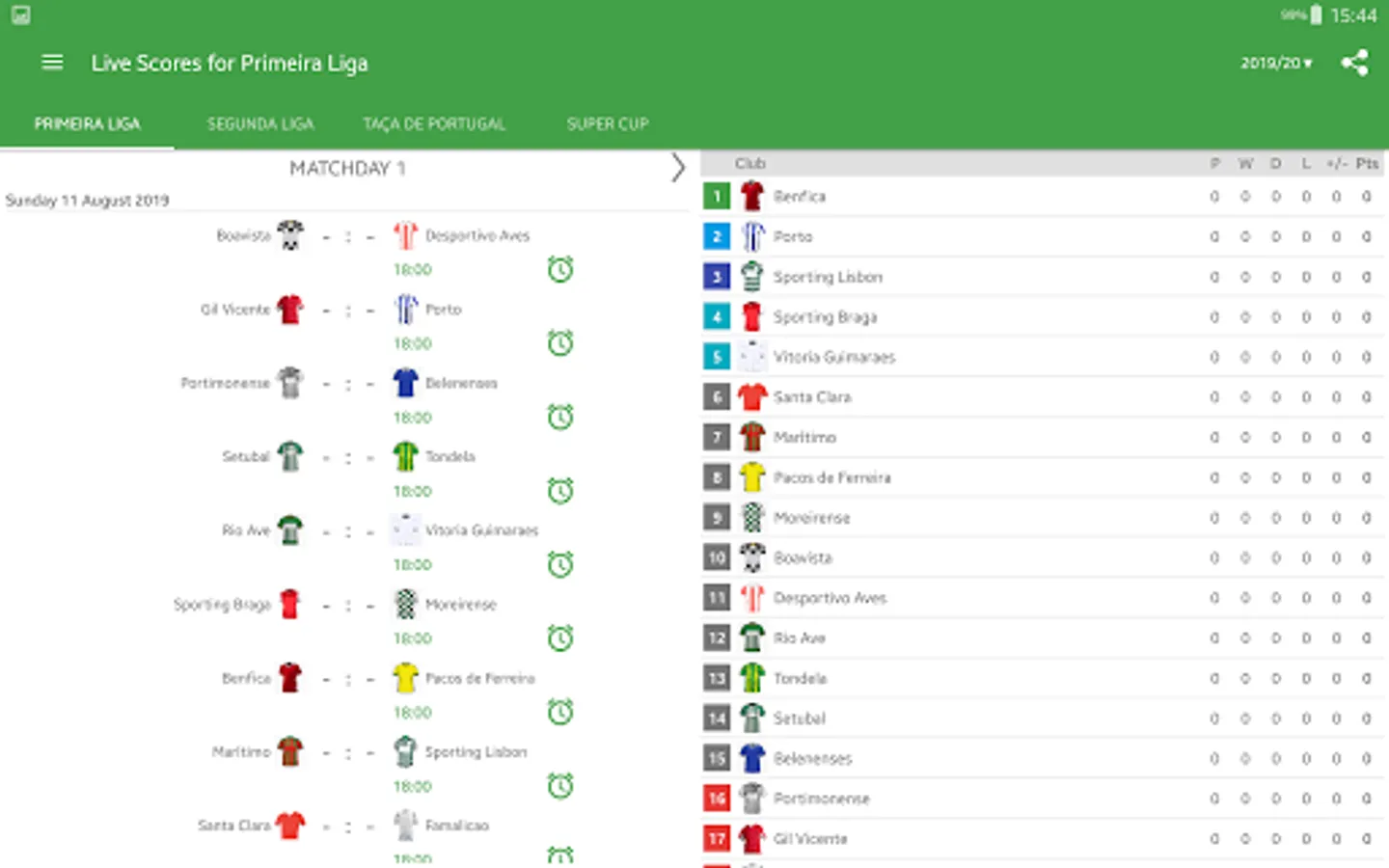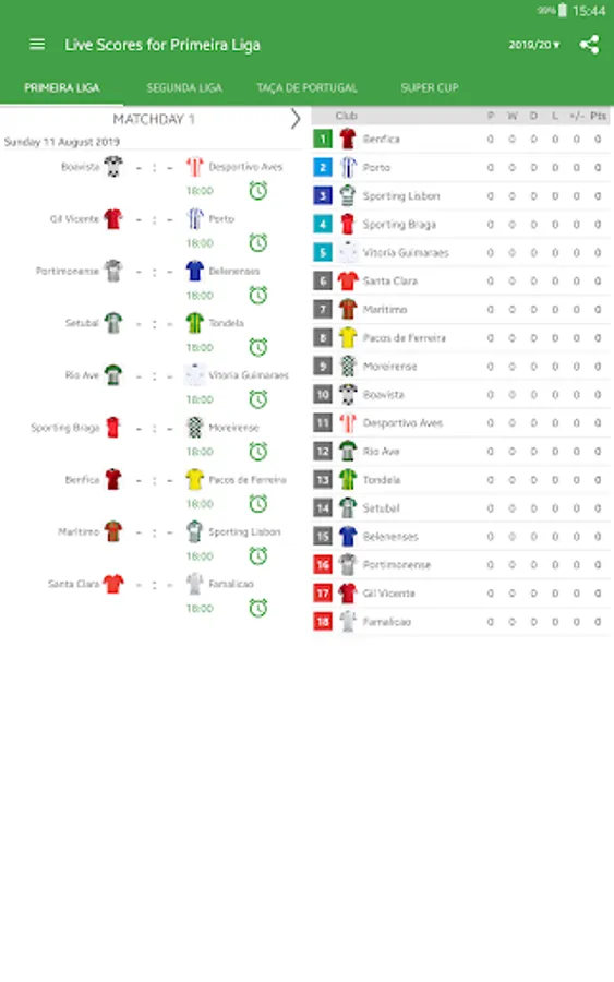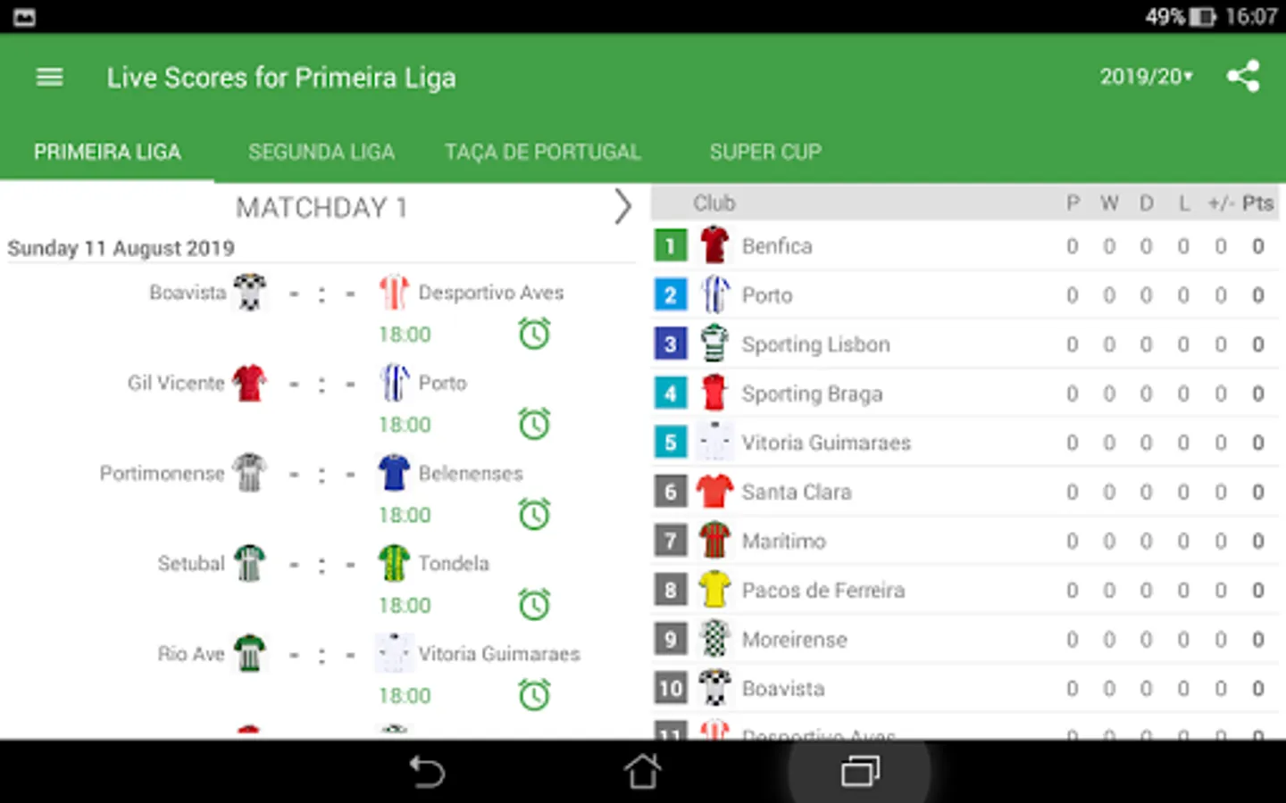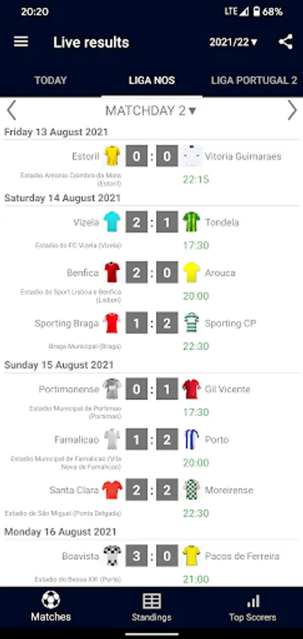 Live Scores for Liga Portugal 2023/2024 is the app that will allow you to follow the matches of Football Championship in Portugal, even you do not have possibility to watch TV or live stream. It includes a calendar, schedule of matches, standings and results of Liga Portugal, Liga Portugal 2 (Segunda Liga), Taça de Portugal and Super Cup. With the application you will not miss a goal or begin of a match, because it will send you a push-notifications. You can select favorite matches and receive notifications only for them. In Primeira Liga season 2023/24 play the teams: Benfica, FC Porto, Braga, Sporting, Guimaraes, Moreirense, Arouca, Gil Vicente, Vizela, Boavista,