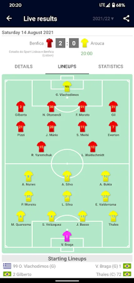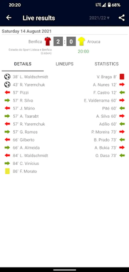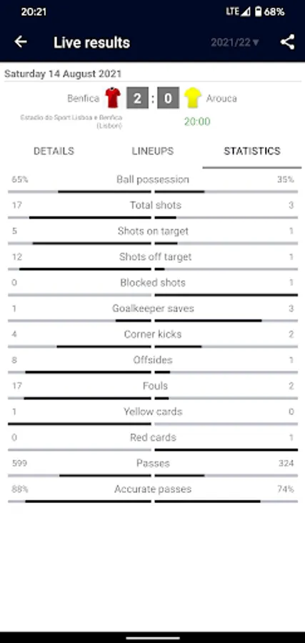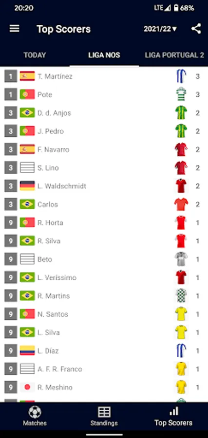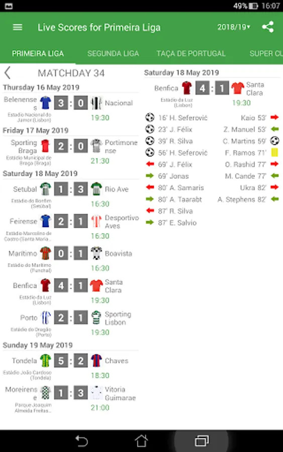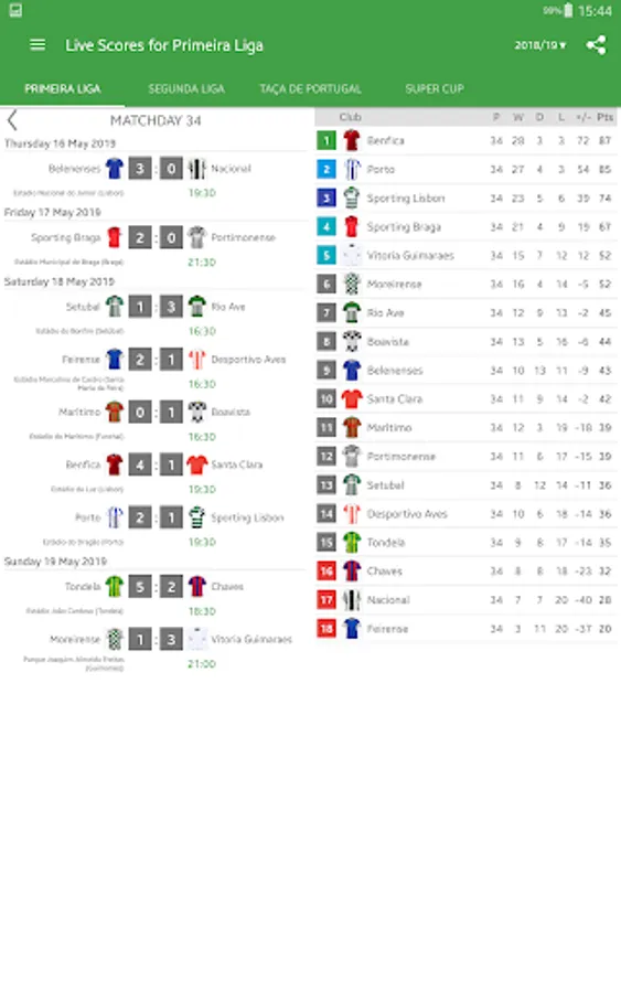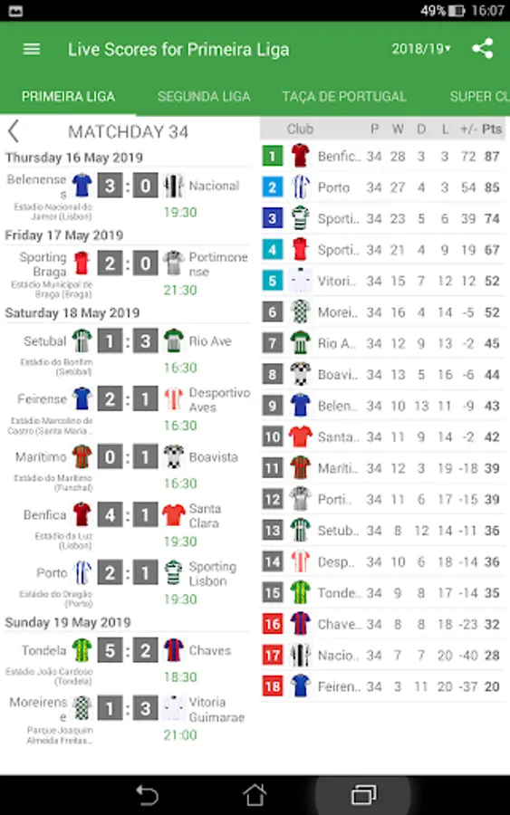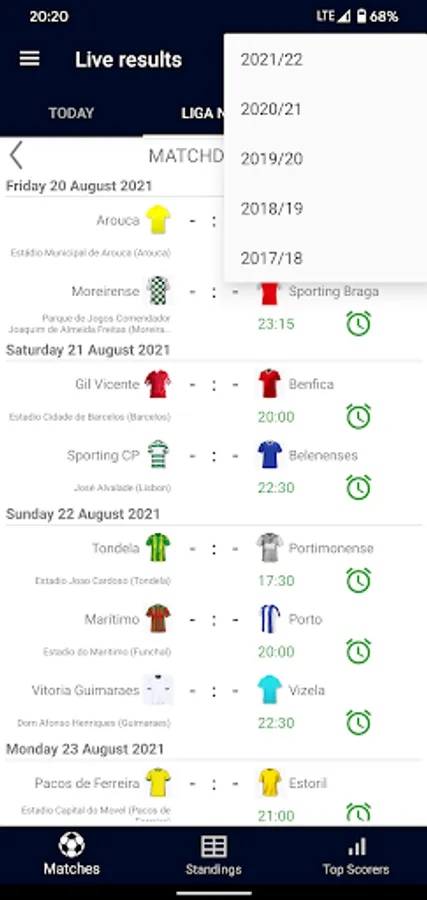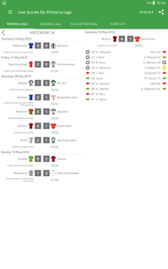Live Scores for Liga Portugal 2023/2024 is the app that will allow you to follow the matches of Football Championship in Portugal, even you do not have possibility to watch TV or live stream. It includes a calendar, schedule of matches, standings and results of Liga Portugal, Liga Portugal 2 (Segunda Liga), Taça de Portugal and Super Cup. With the application you will not miss a goal or begin of a match, because it will send you a push-notifications. You can select favorite matches and receive notifications only for them. In Primeira Liga season 2023/24 play the teams: Benfica, FC Porto, Braga, Sporting, Guimaraes, Moreirense, Arouca, Gil Vicente, Vizela, Boavista,