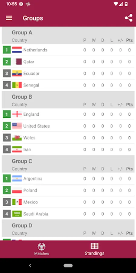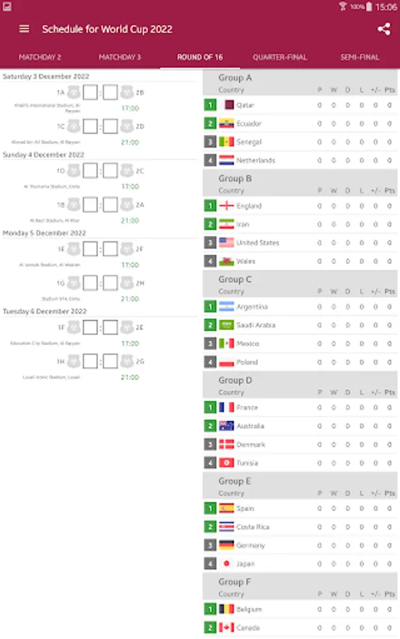 You only need to fill your own results of the matches, and the app itself builds all the tables of the group and calculates which teams will go into the playoffs.
