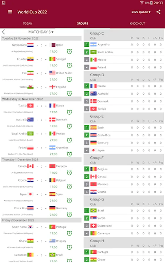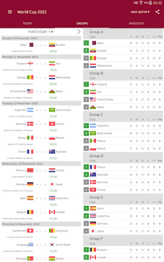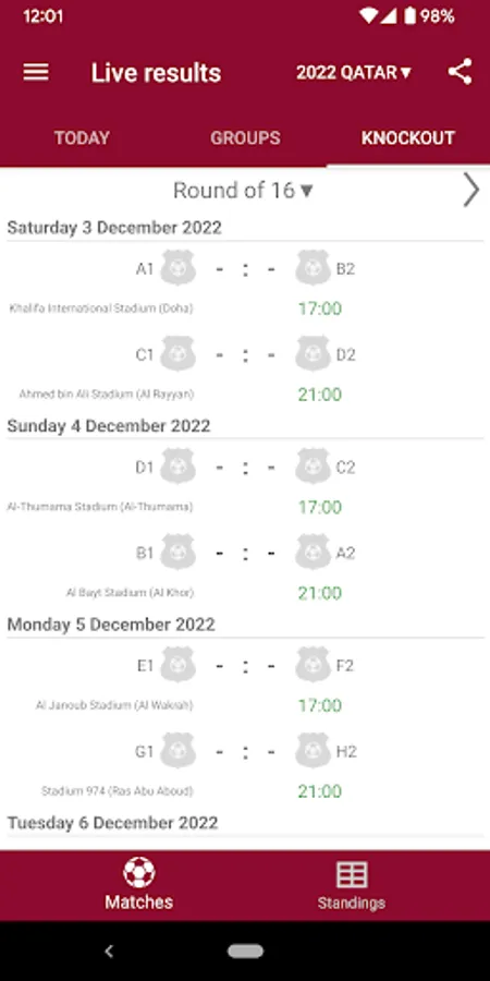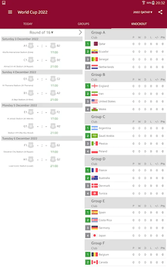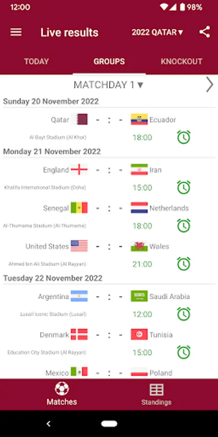 Live Scores for World Cup 2022 is the application that will help you to follow live results of World Cup 2022, even you do not have possibility to watch TV or live stream. The application contains a calendar, a schedule of all the matches, top scorers and live scores for WC 2022. With the application you will not miss a goal or begin of a match, because it will send you a push-notifications. You can select favorite matches and receive notifications only for them.
