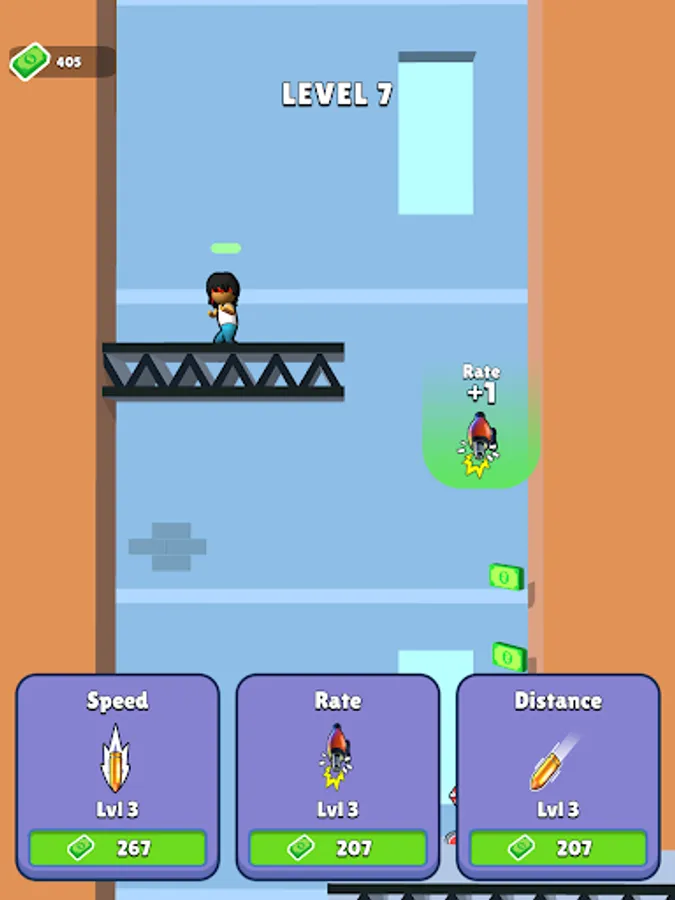 Strategically fall through the level to maximize your shooting flow. Pass the gates to upgrade your weapon. Shoot and stomp your enemies