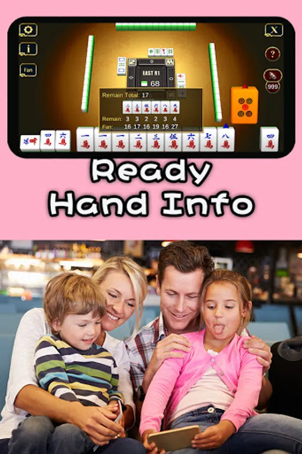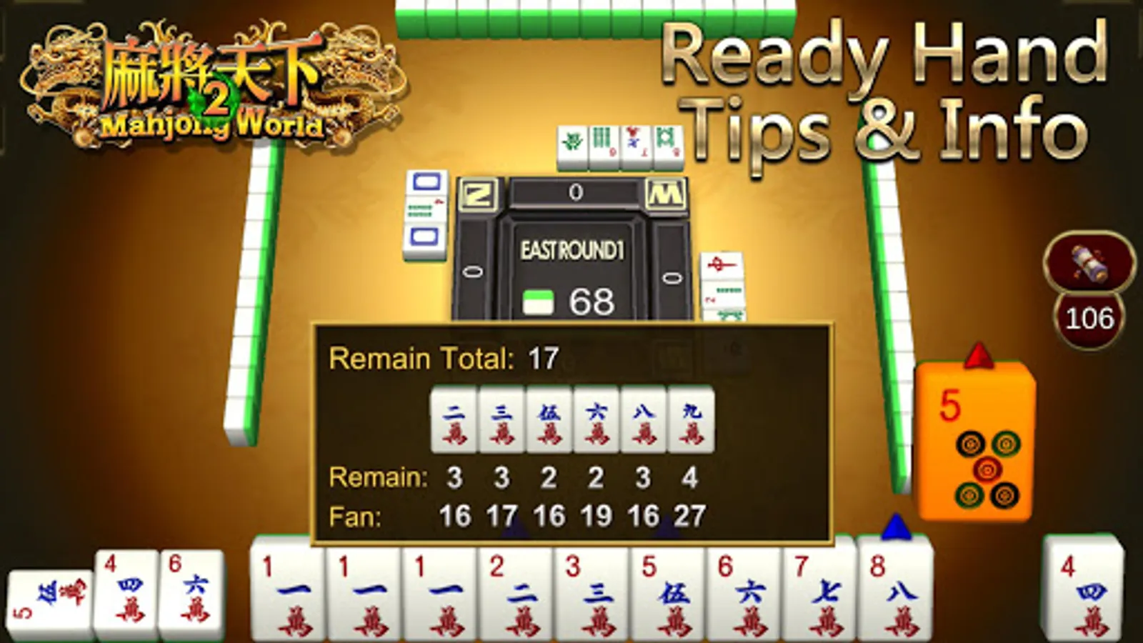 @ "Ready Hand Info" Tap & Hold the red arrow tile will display the tile you need for “Mahjong”, how many are left and the Fan (score).