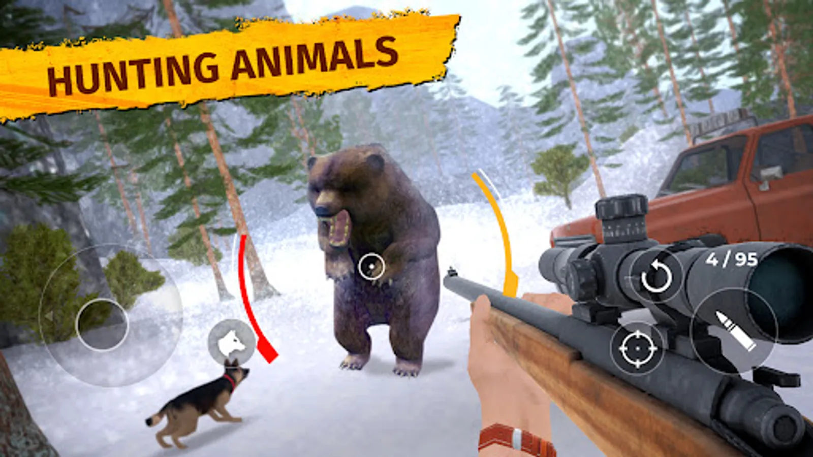 Use joystick to move, use aim button to aim for better shots and convenient hunting but try to stay invisible to the wild animals like deer or bear.