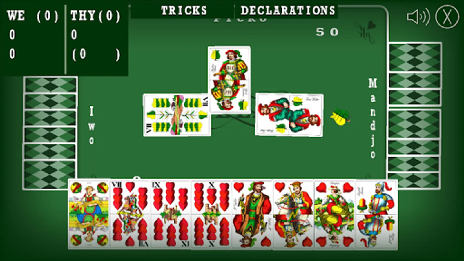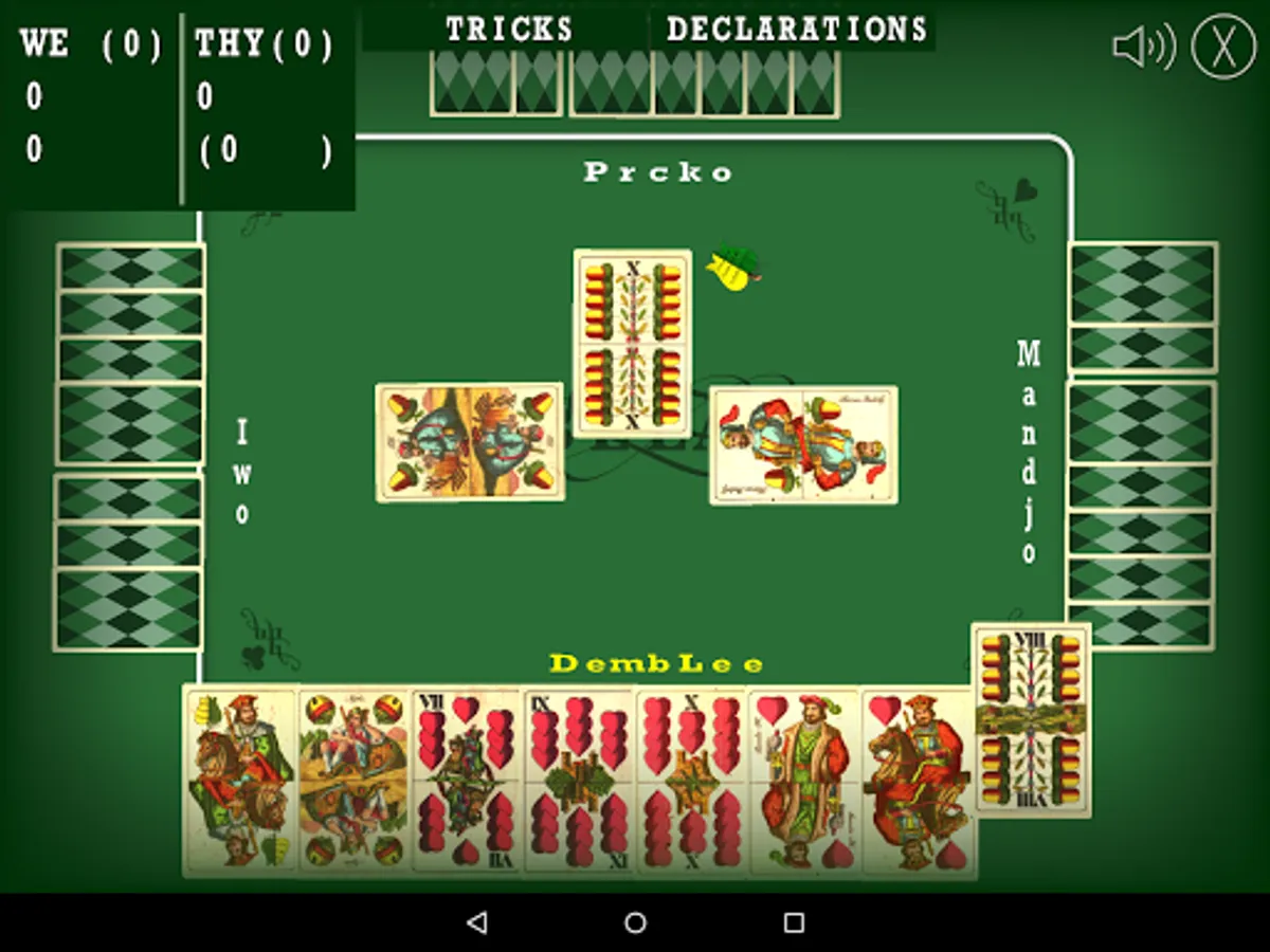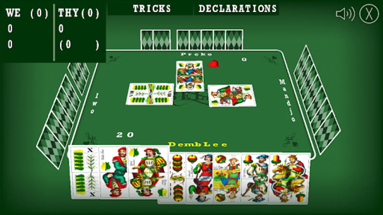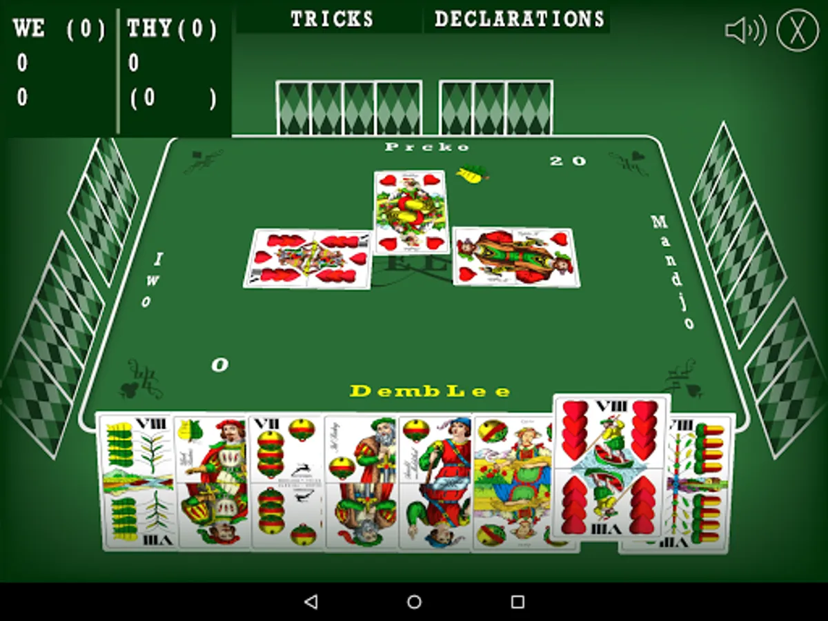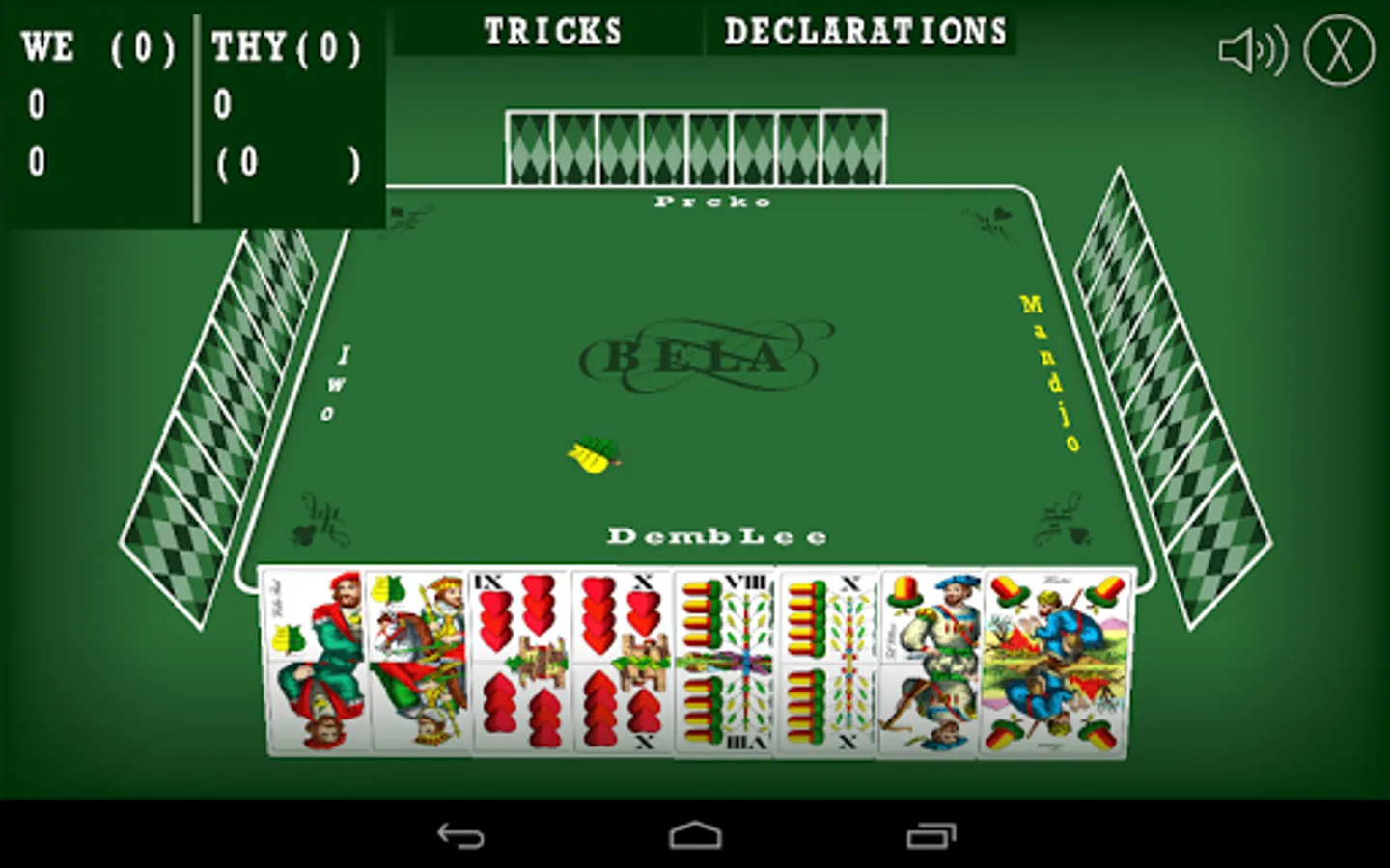 Bela (or Belot), a simulation of popular card game. Game is played with 32 hungary styled cards. This card game is mostly played on Balkans, and maybe some other parts of the world. You are playing a four player game, where your team plays against team of (so called) artificial intelligence players.