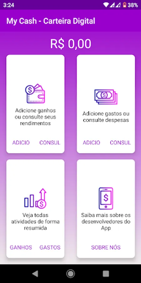 MyCash is an APP developed to help you control your finances. With it you can control your activities, being able to register your income as salary or earnings of any kind, and your expenses as card bills, bills, fuel. That way you'll know where that extra earned at work went.