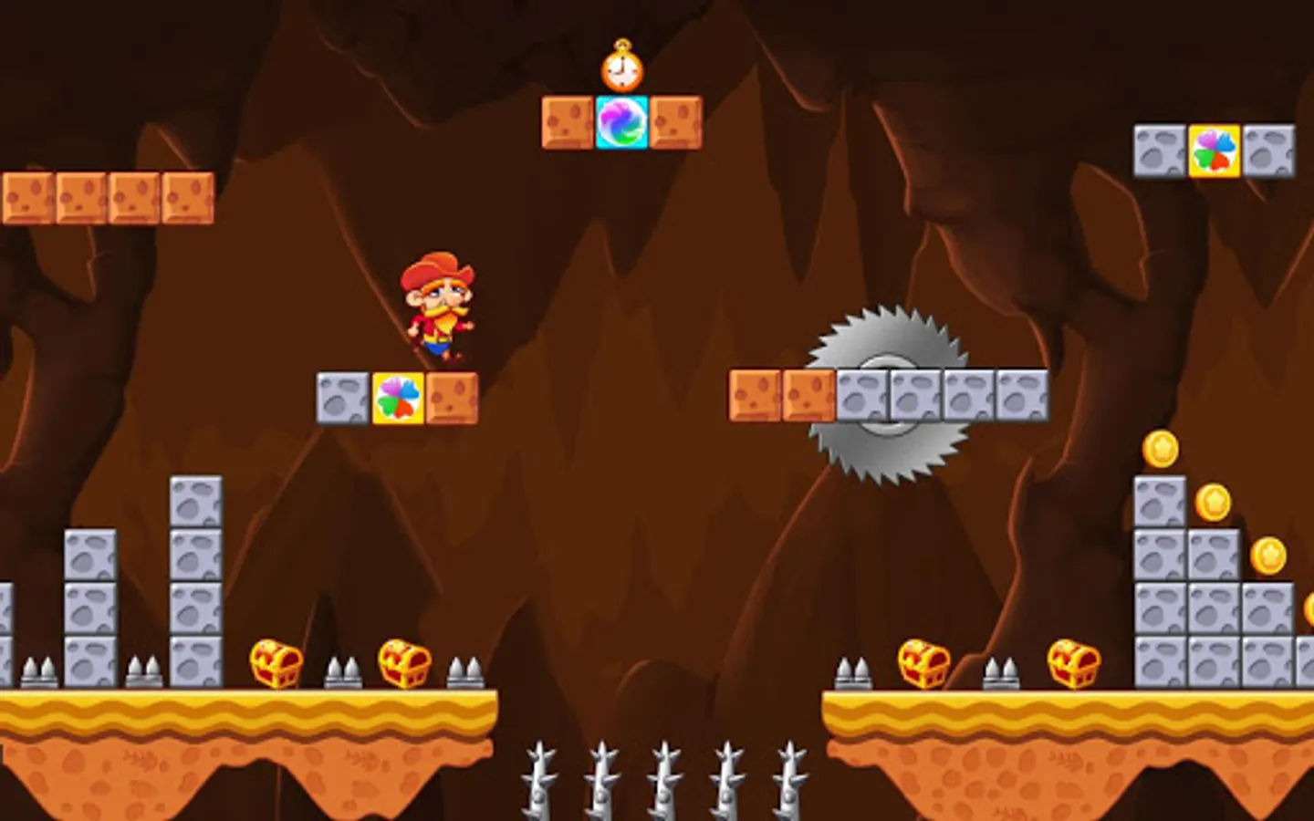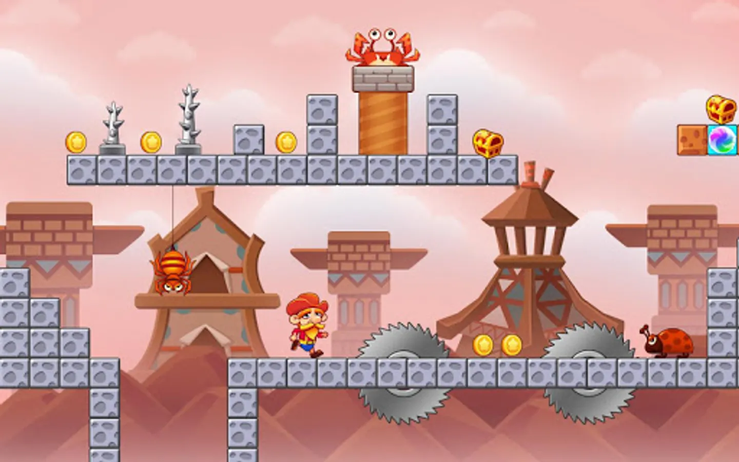 Tap to run, jump and explore blocks. Travel across dangerous forest, volcano, desert, swamps, machine room,etc. Collect coins, gold, hammers to help you defeat the Monster!