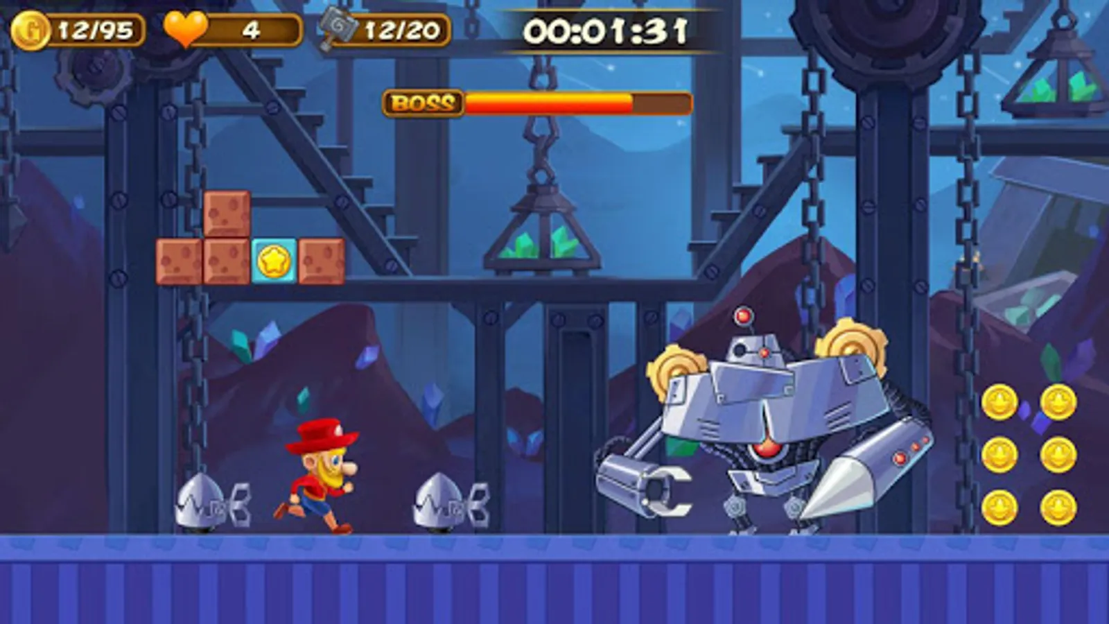 Run, jump and explore the arcades. Travel across dangerous forest, volcano, desert, swamps, machine room, etc. Collect coins, gold, hammers to help you defeat the Monster!