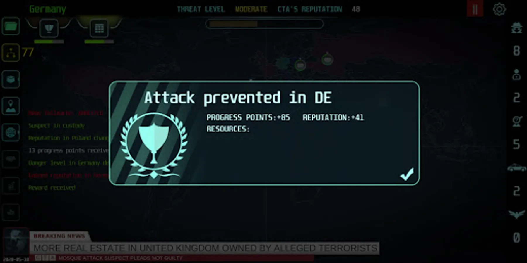 Your prevent and strike power depend on the resources you manage. The more you have, the stronger you are. Earn points by successful actions, spend them on additional swat or drone units. Be prepared.