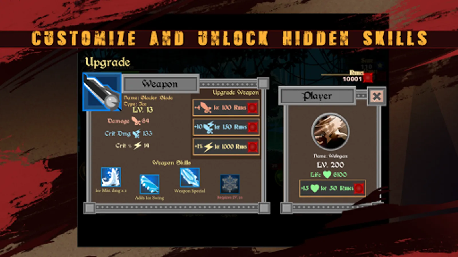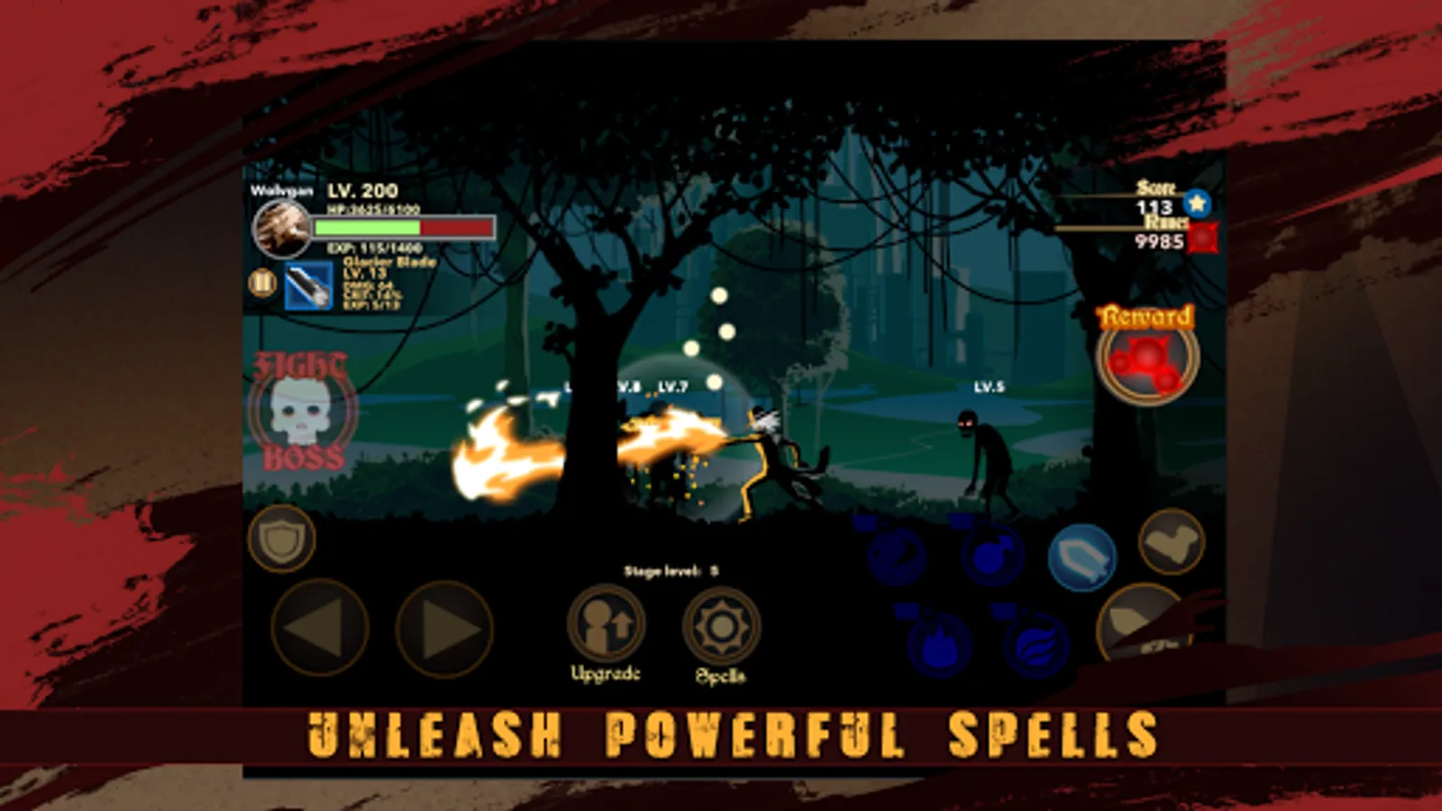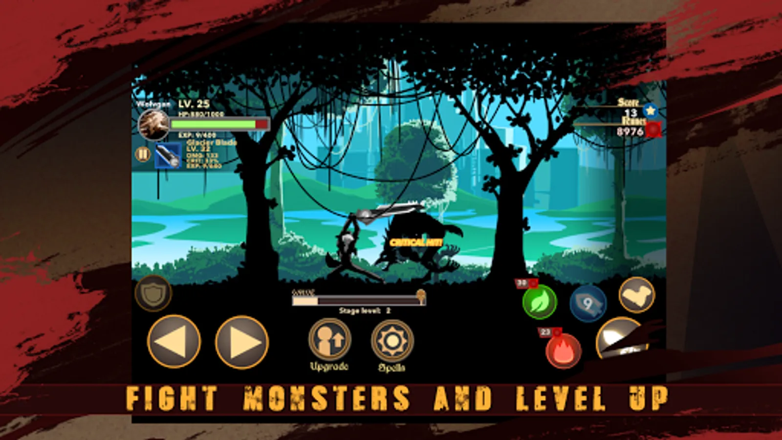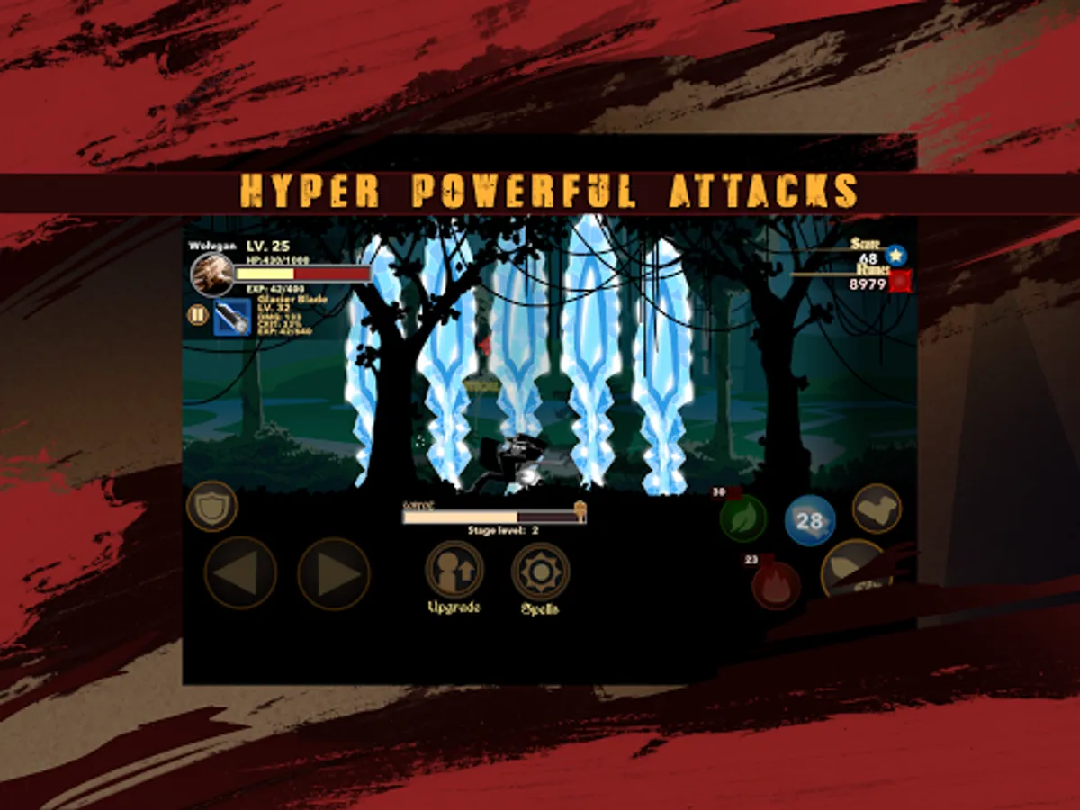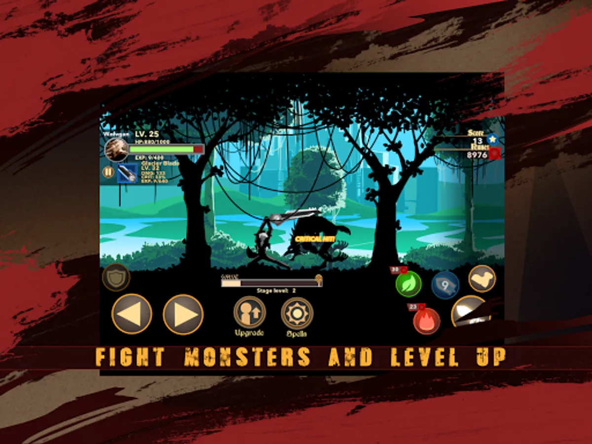 The inhuman stickman can upgrade life and weapon to calibre damage. Weapon upgrade includes attack and spell damage, critical damage and chances of critical strike!
