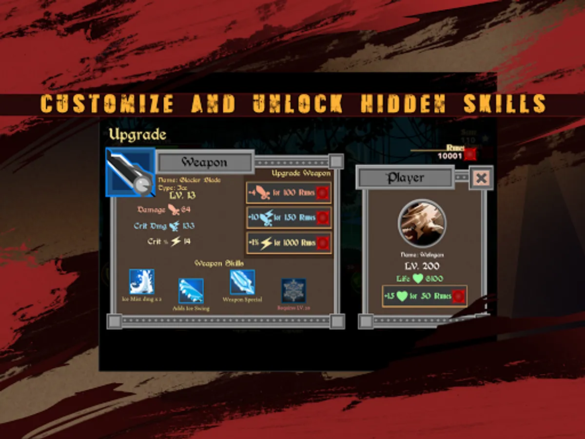 Rush to slay monsters and gain experience that allows you to Level up! Every time you power LEVEL UP, you increase your life and acquire new spells! Each level can upgrade both spell damage and weapon damage. You can unlock new Blade weapon skills that gains you more effective attacks and ultimate moves!