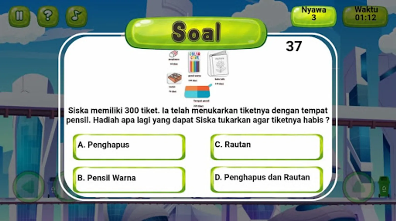 In this application there are two levels from beginner and advanced. The beginner level itself is intended for grades 1-3 and the advanced level is intended for students in grades 4-6. In the game, the user will move the character to complete the quiz contained in the flag of each level until the gate to continue to the next level opens. In SI IMPORTANT games or games there are time and lives that players must pay attention to when playing SI IMPORTANT. When the player does the quiz, the student will know the results of the answer and the value of the level. and so on until students reach the target to their destination, namely school.