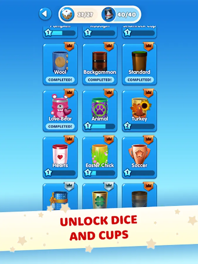 Progress through the classical dice game and open mysterious treasure chests. What collection of new Cups and Dice will you find? Personalise your game by levelling up your collection to stand out from the crowd. Join the community and battle against those who share the same passion for dice games as you!