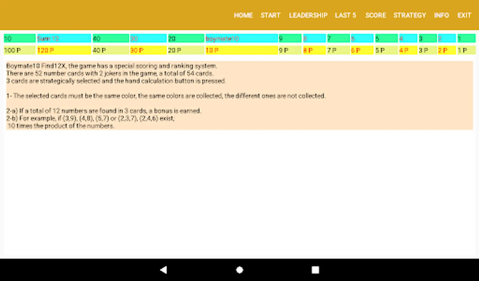 While the total score is obtained in the game, it is paid attention that the sum of points for 2 or 3 cards is 11. If there is an 12, 10 times the product of the number values of 2 or 3 cards that make 11 are written on the score table. For example, the total point value of cards 3 and 9 is 3x9 = 270 points, while the total point value of cards numbered 1,5 and 6 is 1x5x6x10 = 300 points.