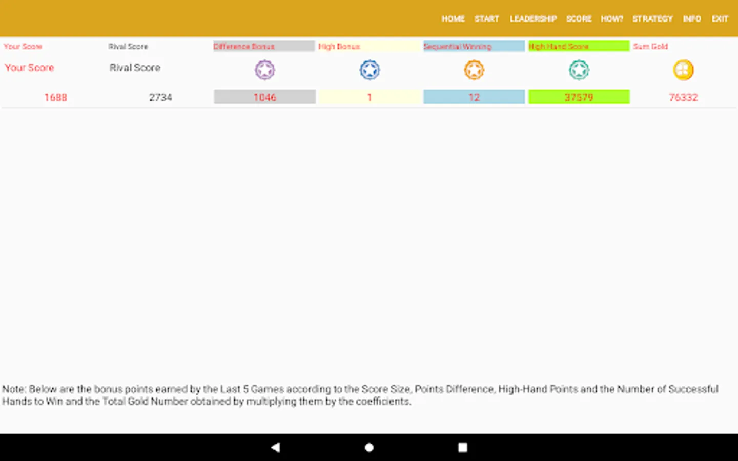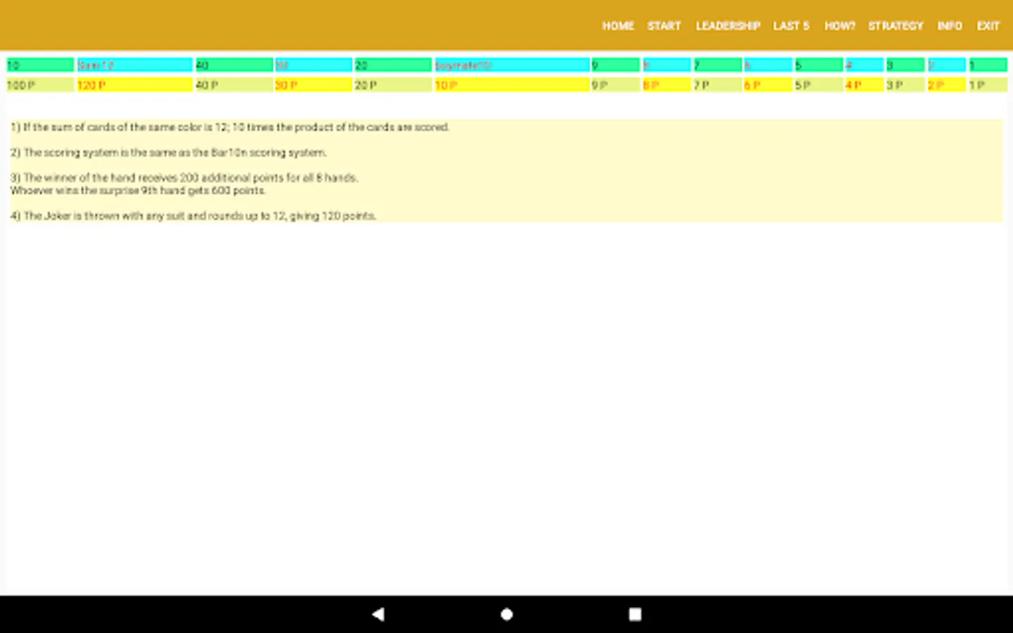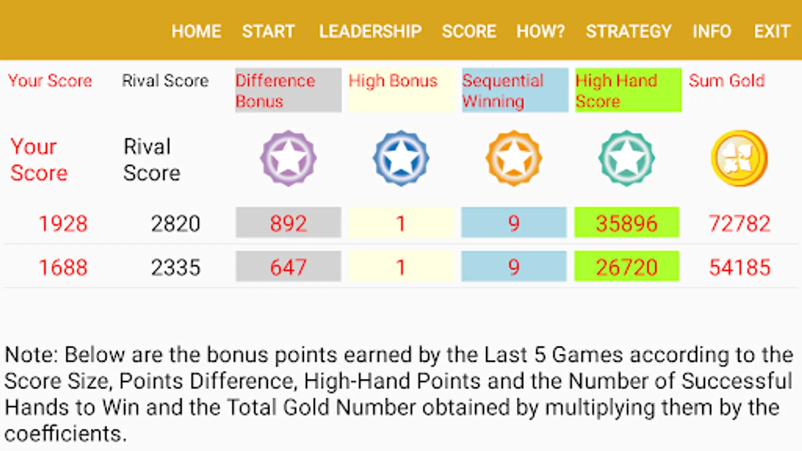 After each hand has been strategically chosen and discarded 3 cards, a card is received and the game lasts 9 hands. The first 8 hands with the highest number of cards in the game wins plus 200 hand points. The final hand point is a surprise and is 600 points. The player with the highest total score of 9 hands wins. The additional points of the game determined by special coefficients are also calculated and written on the leaderboard.