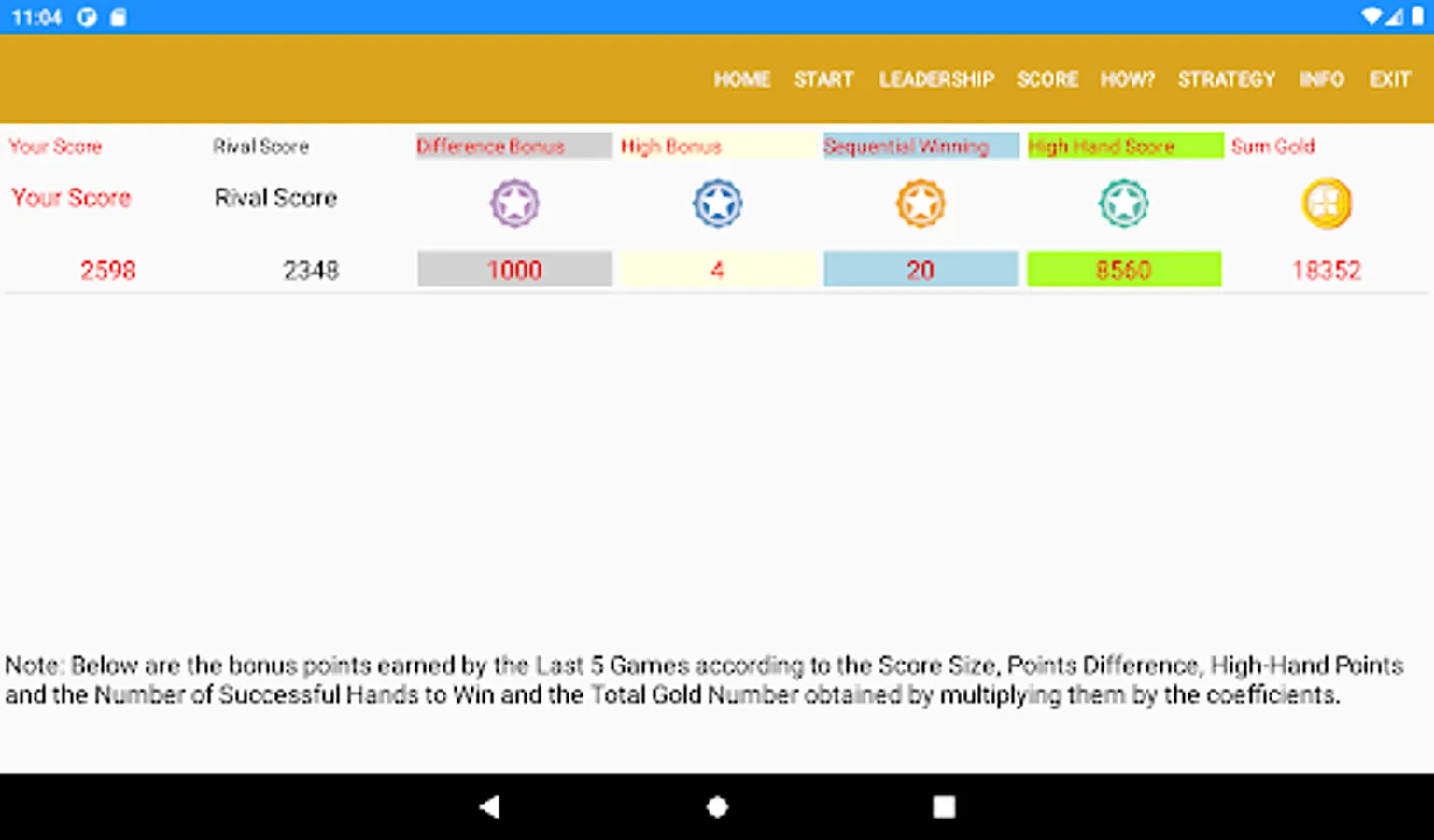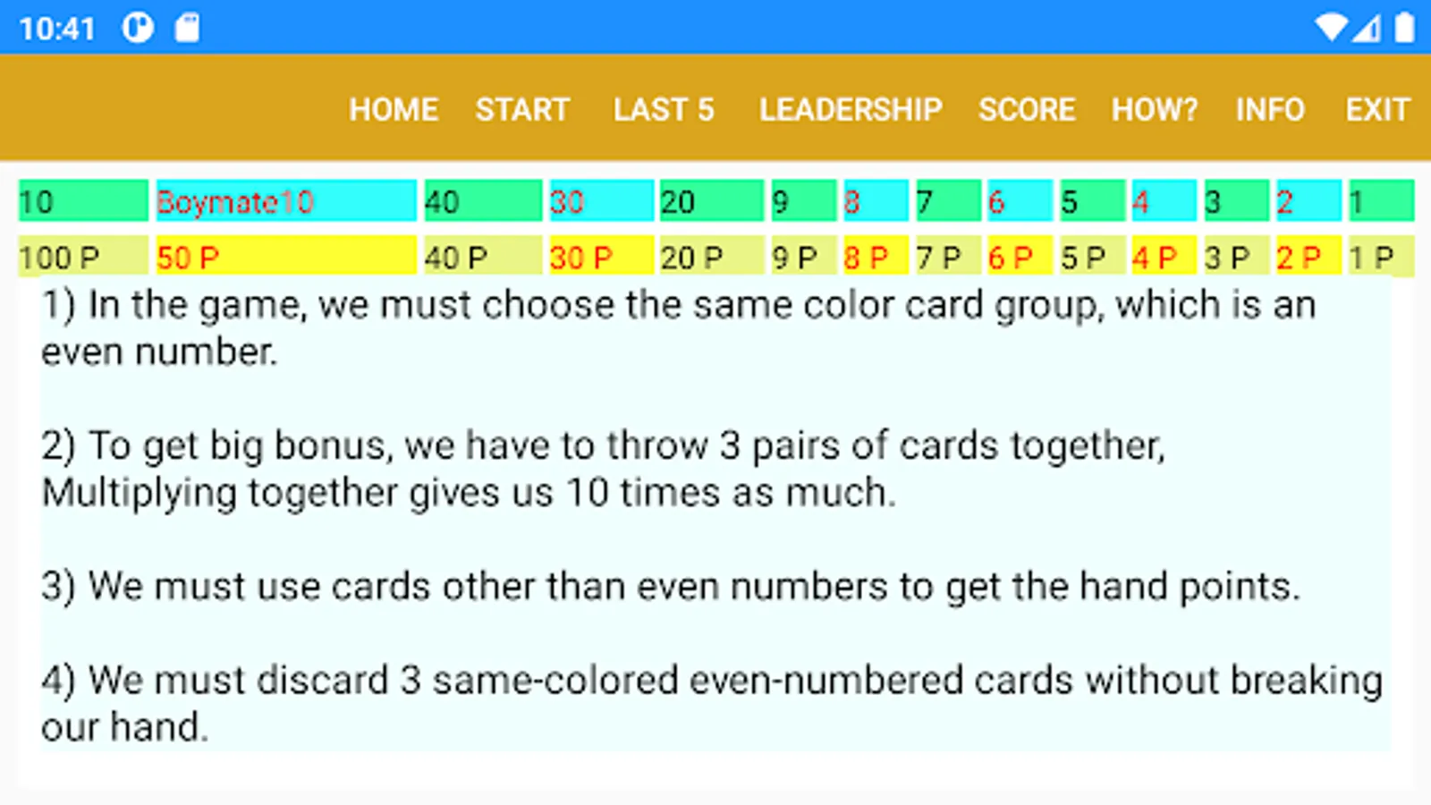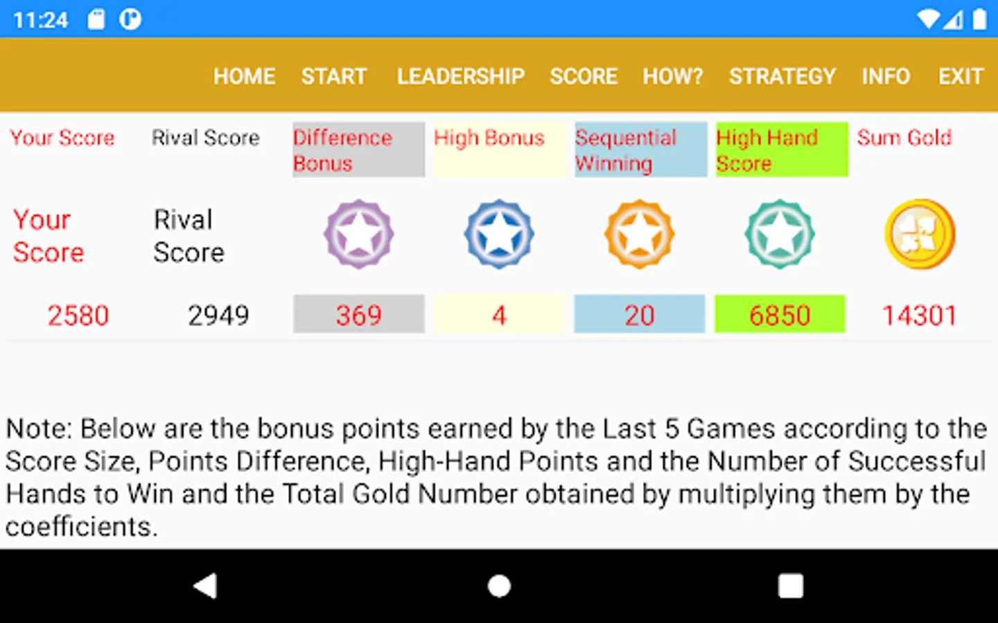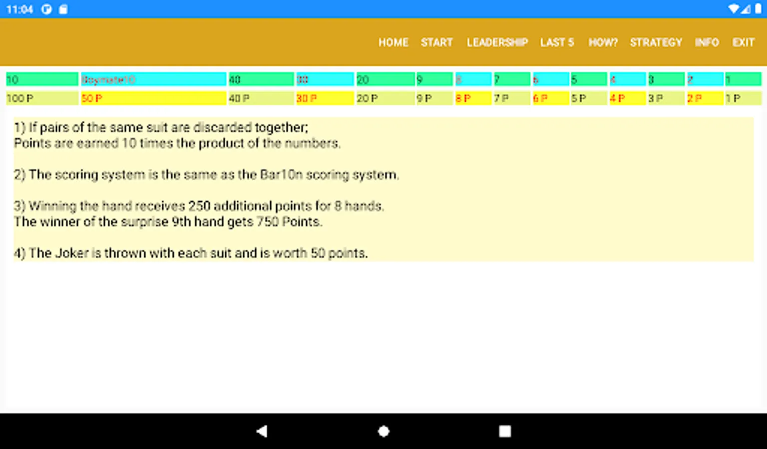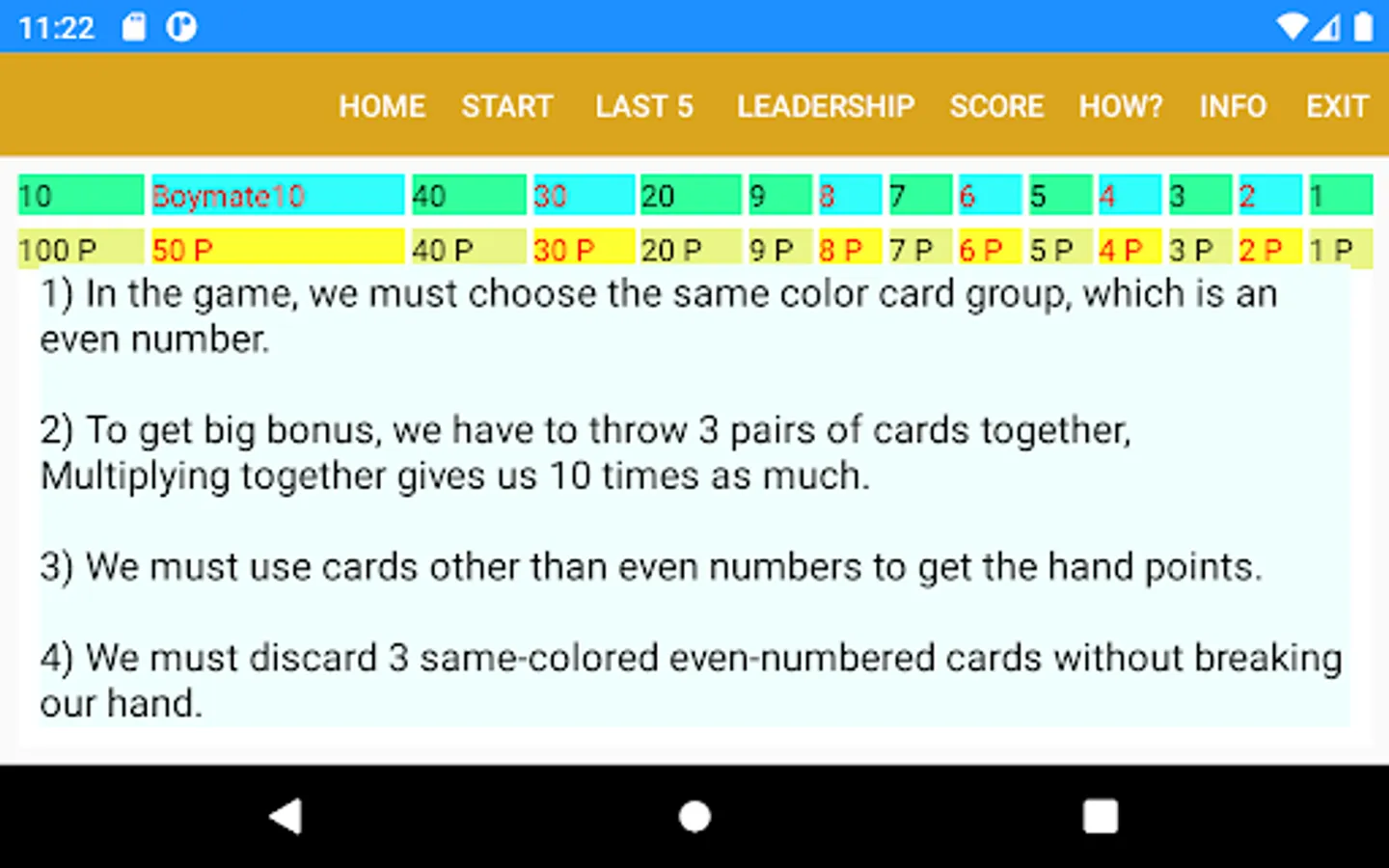 After each hand has been strategically chosen and discarded 3 cards, a card comes from the deck and the game lasts 9 hands. The first 8 hands with the highest number of cards in the game wins plus 250 hand points. The final hand point is a surprise and is 750 points. The player with the highest total score of 9 hands wins. The additional scores of the game determined by special coefficients are also calculated and written on the leaderboard.