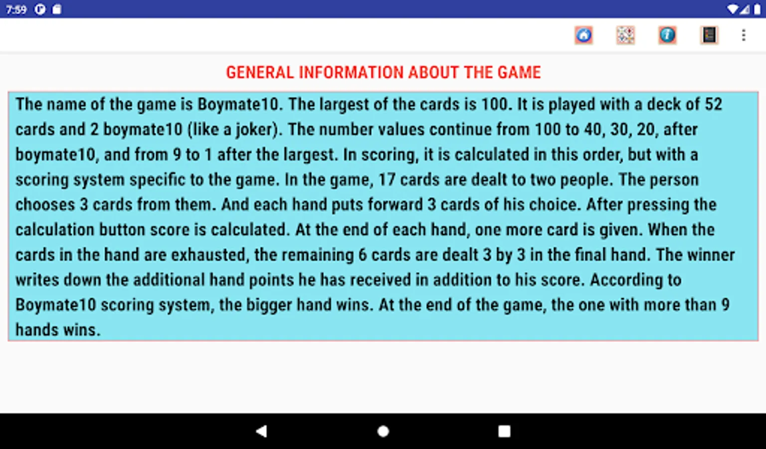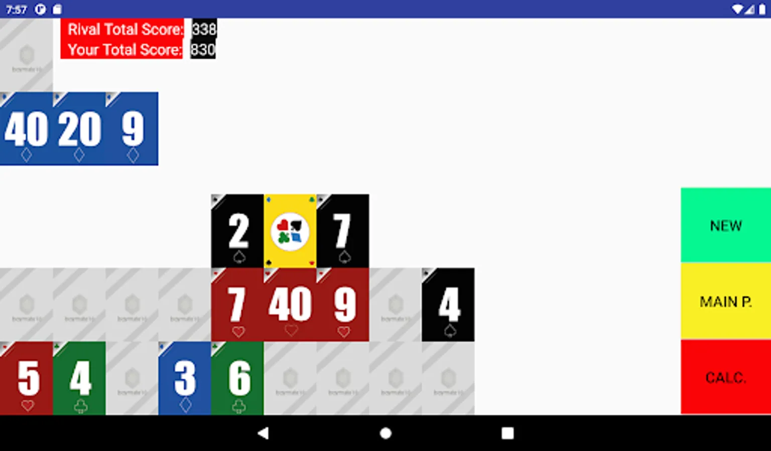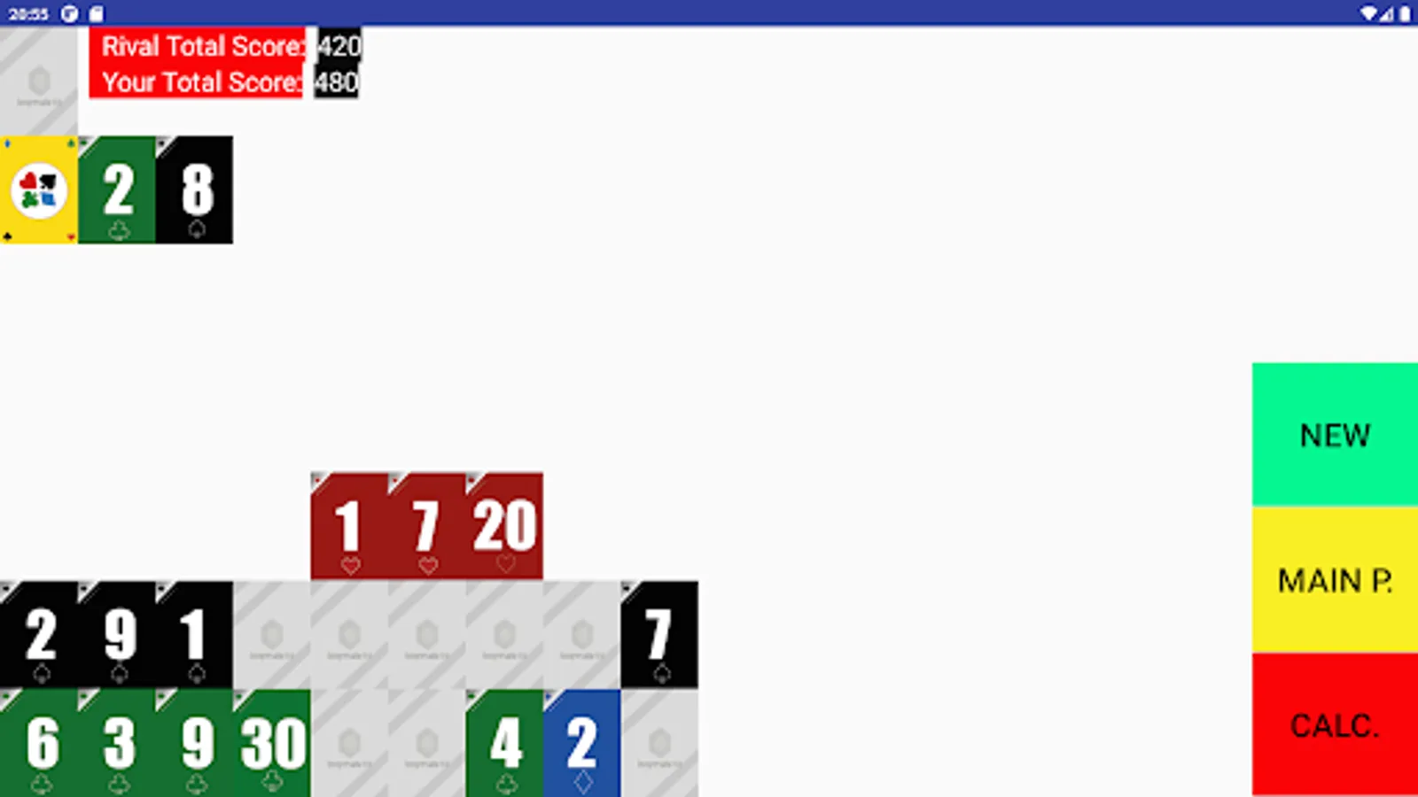 The game consists of a total of 54 colored geometric number cards. And each card has a game-specific point value and rank. In the game, 34 cards are dealt to the parties, 17 each, and 20 cards are left on the ground.