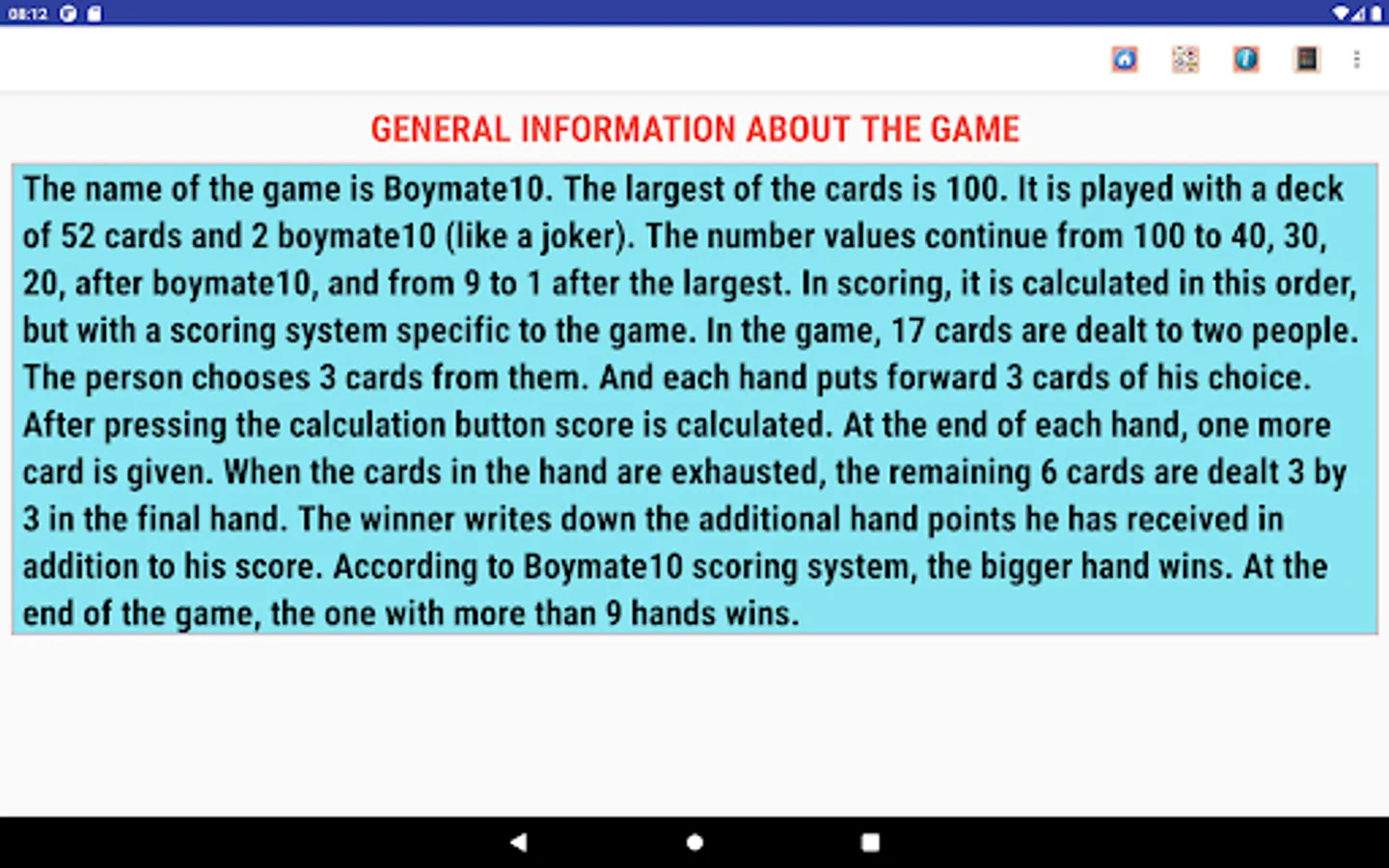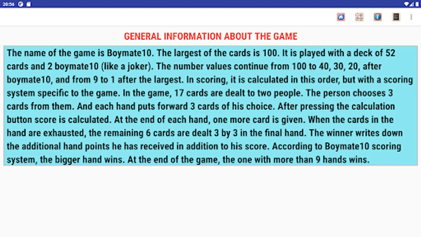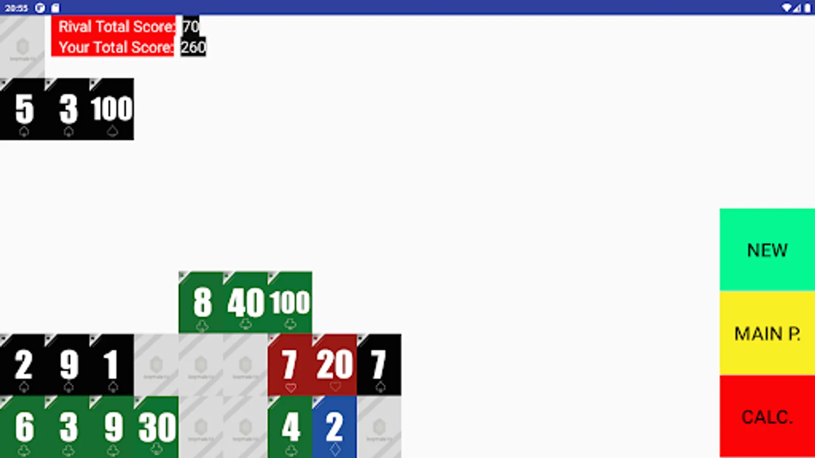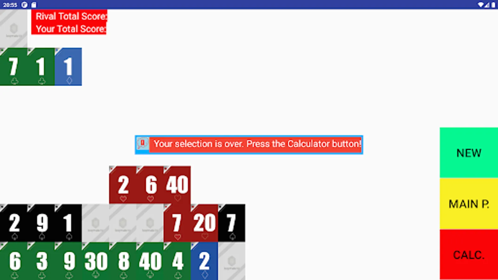 After each hand 3 cards are strategically chosen and discarded, a card comes down from the deck, thus the game lasts 9 hands. In the game, the first 8 hands with the highest number of cards in the hand plus 100 hands wins the point. The final hand point is a surprise and is 300 points. The player with the highest total score of 9 hands wins. Additional points of the game determined by special coefficients are also calculated and written on the leaderboard.
