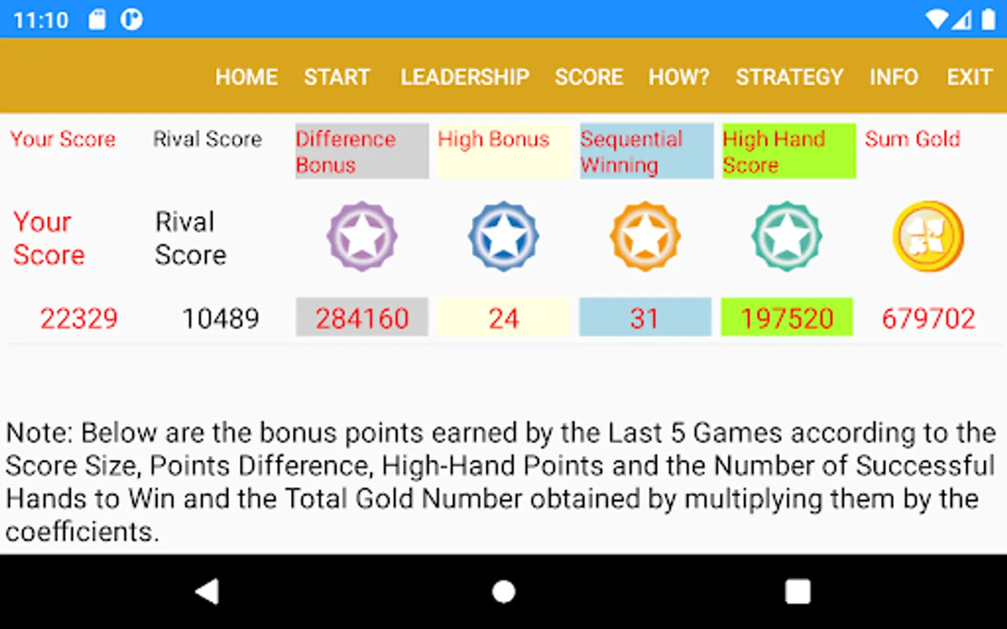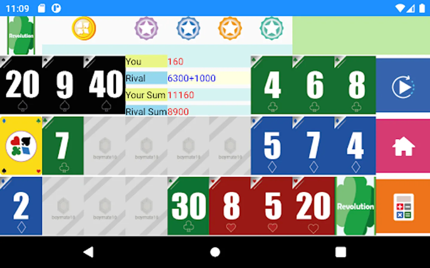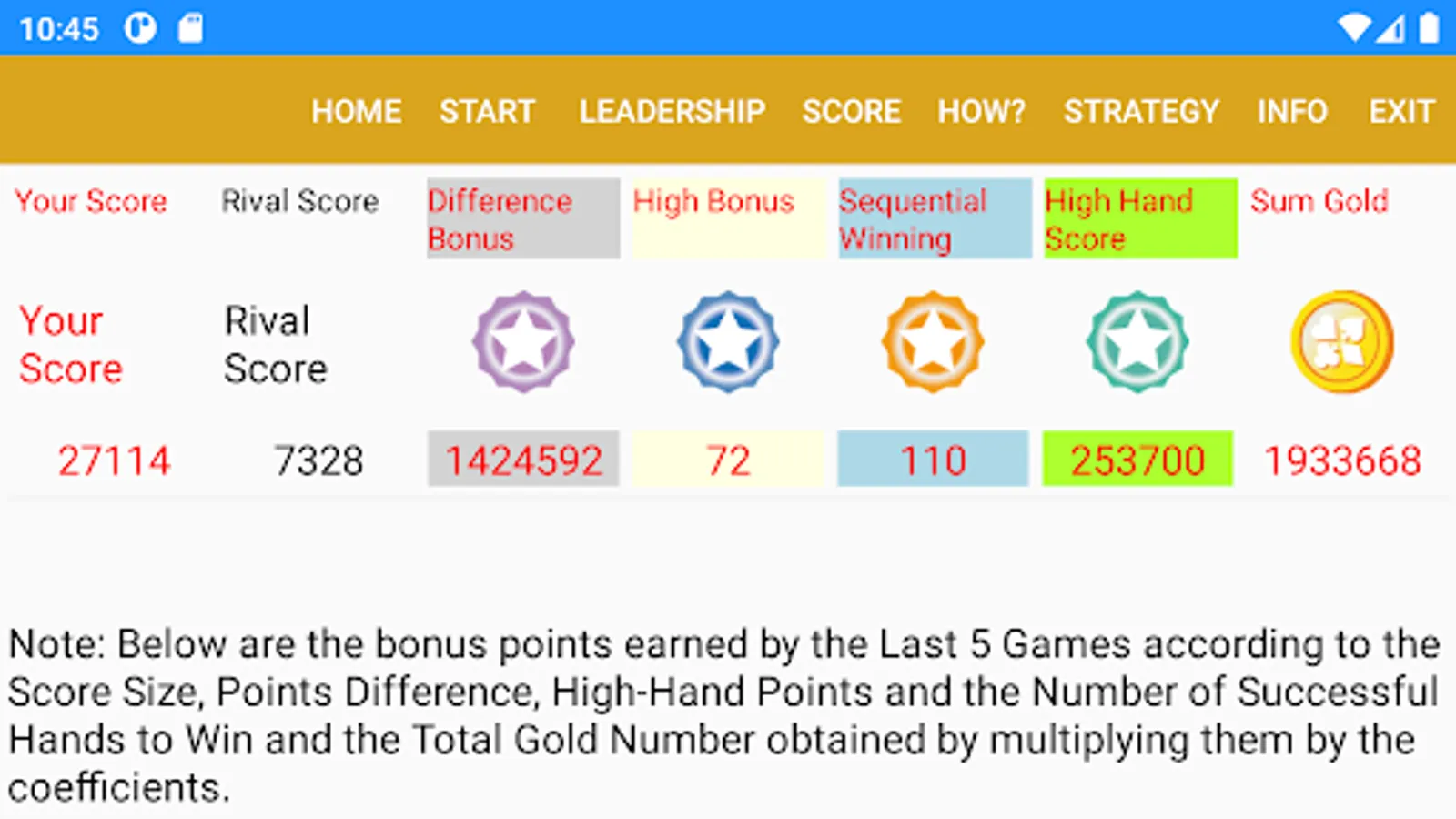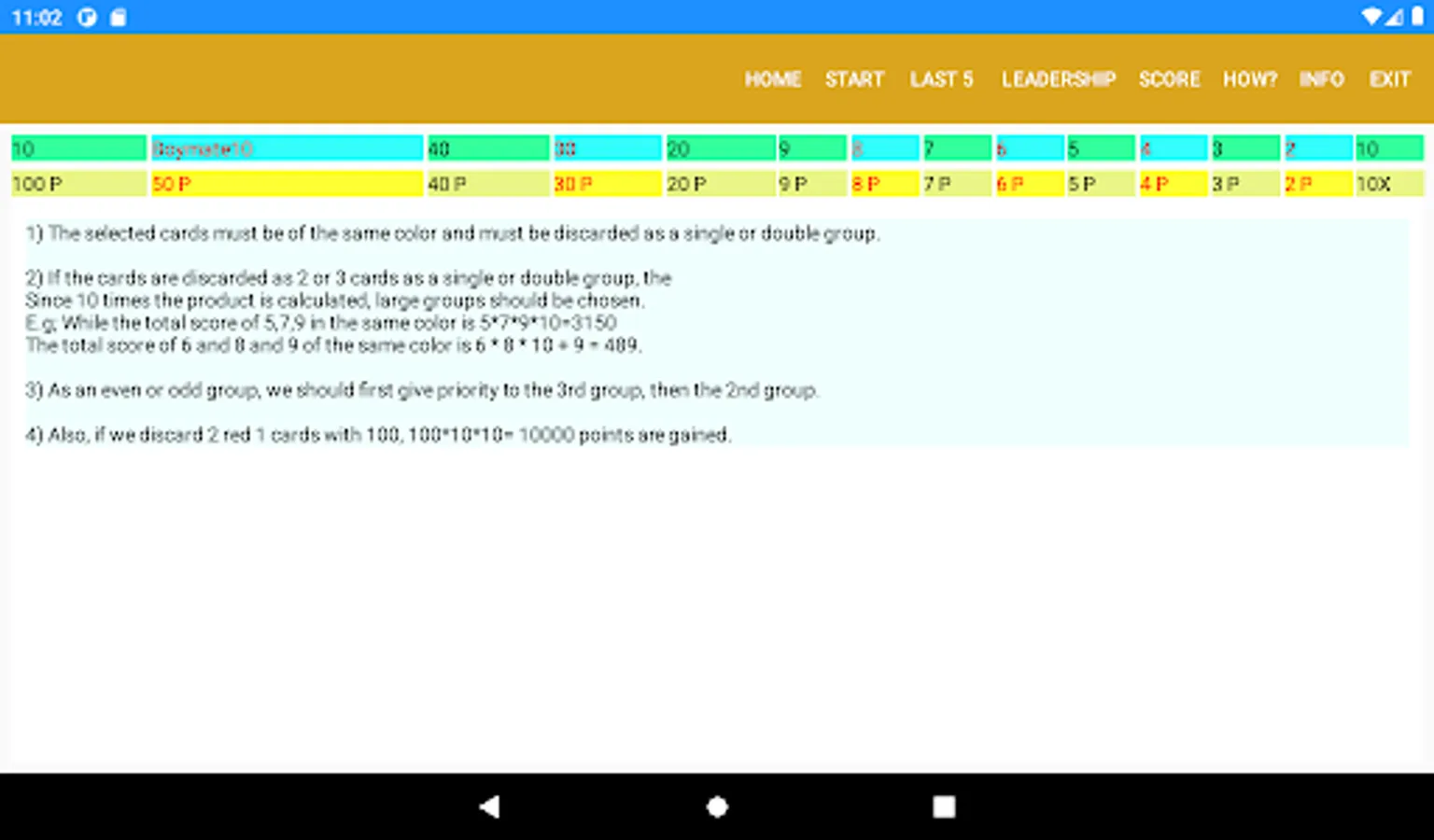 After each hand has been strategically selected and discarded 3 cards, a card comes out of the ground and the game lasts 9 hands. In the game, the first 8 hands with the highest number of cards in the hand wins plus 1000 hand points. The final hand point is a surprise and is 3000 points. The player with the highest total score of 9 hands wins. The additional scores of the game determined by special coefficients are also calculated and written on the leaderboard.