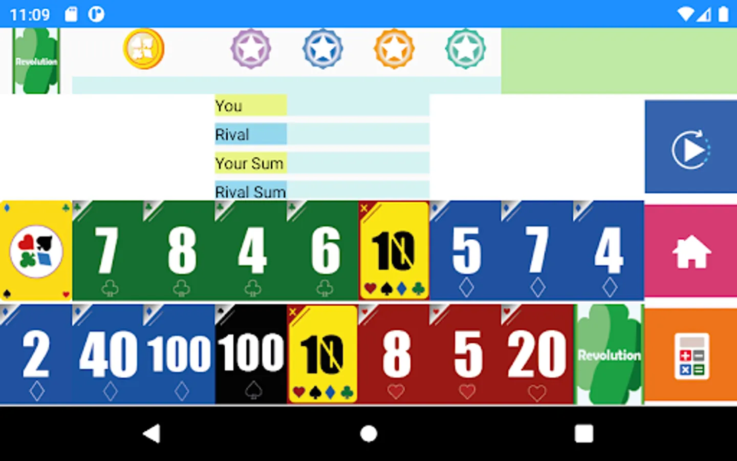 The game consists of 54 colored geometric number cards in total. And each card has a game-specific point value and rank. In the game, 34 cards are dealt to the parties, 17 of them each, and 20 cards are left on the floor.