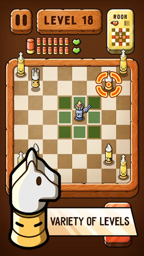 Each level presents a different chessboard layout, populated with various chess pieces. Navigate carefully, as you'll encounter abysses, traps, and mines that add an extra layer of complexity to the game.