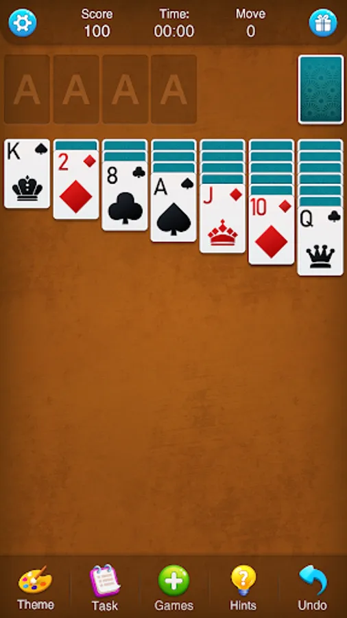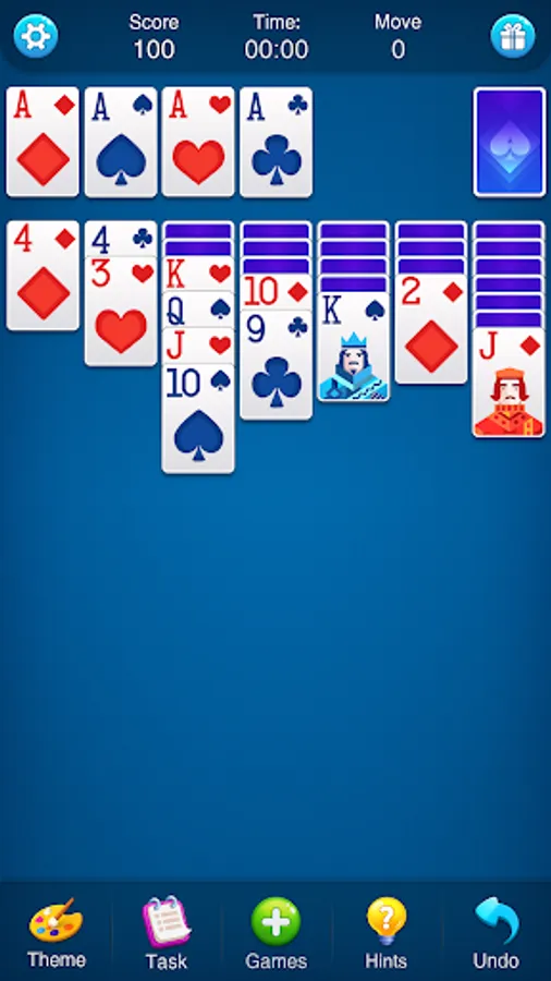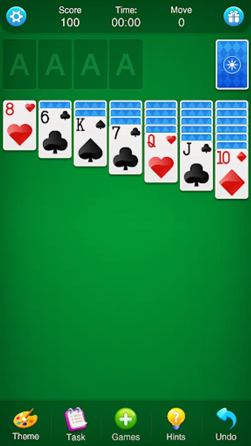 There are seven piles of cards. The top card in each pile is visible with its suit facing up. If the card you want is hidden, you can move cards around until finding the wanted one. Then you drag the card and put it into the desired card slot. If one of the seven piles is cleared, you can place a K card in this empty pile.