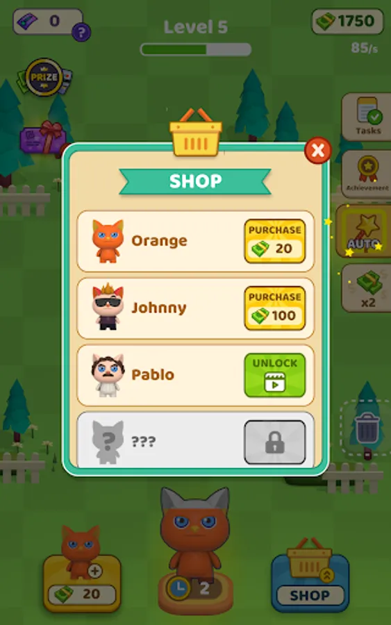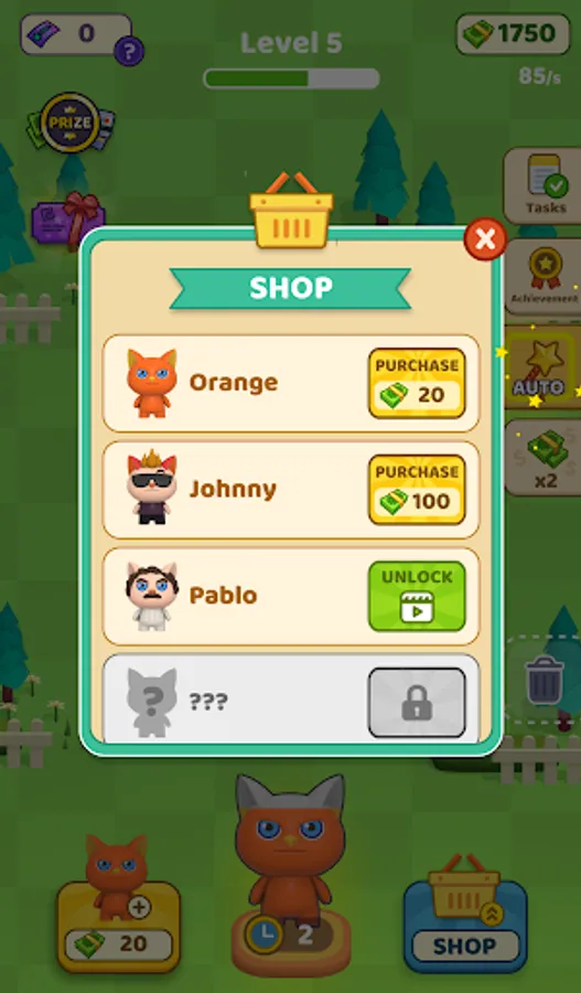 Each kitten has its own skin and brings a certain income. To get more profit, combine two identical pets, and get a new one of a higher level. This new kitten will bring even more profit and you can merge them as well. You can also purchase new slots for your kitties and new characters to expand your team!