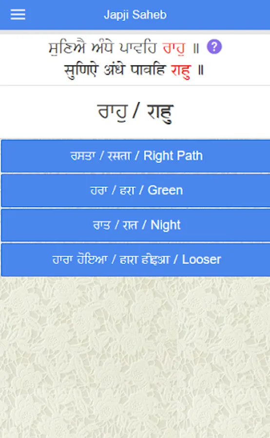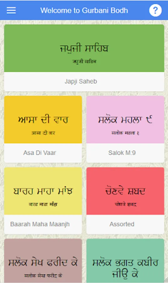 While reading Gurbani, did you ever wonder, what's the meaning of a word in that Gurbani Tuk. If yes, this app is definitely for you. This app would be helpful to you in understanding the meaning of different words in Gurbani and thus helpful in understanding the meaning of complete tuk. Banis currently included are Japji Sahib, Asa Di Vaar, Salok M9, Salok Kabeer Ji, Salok Fareed Ji, Baarah Maah Maajh and some Random shabads.