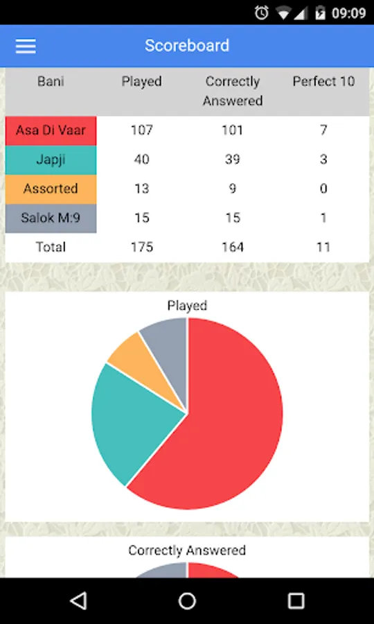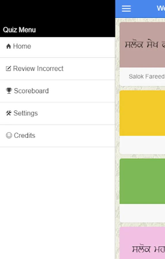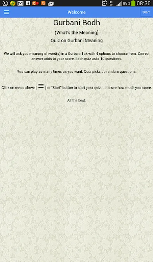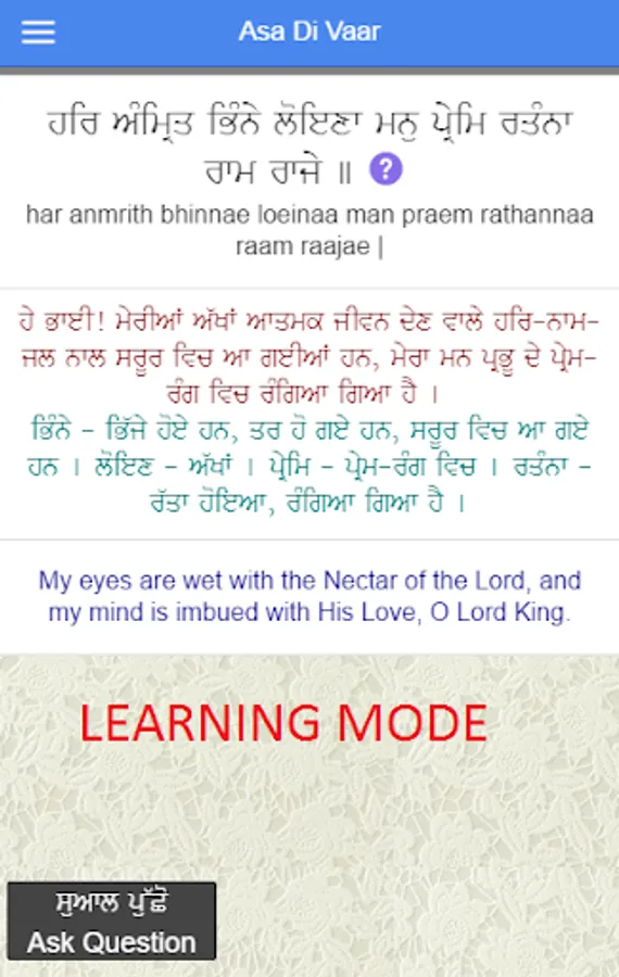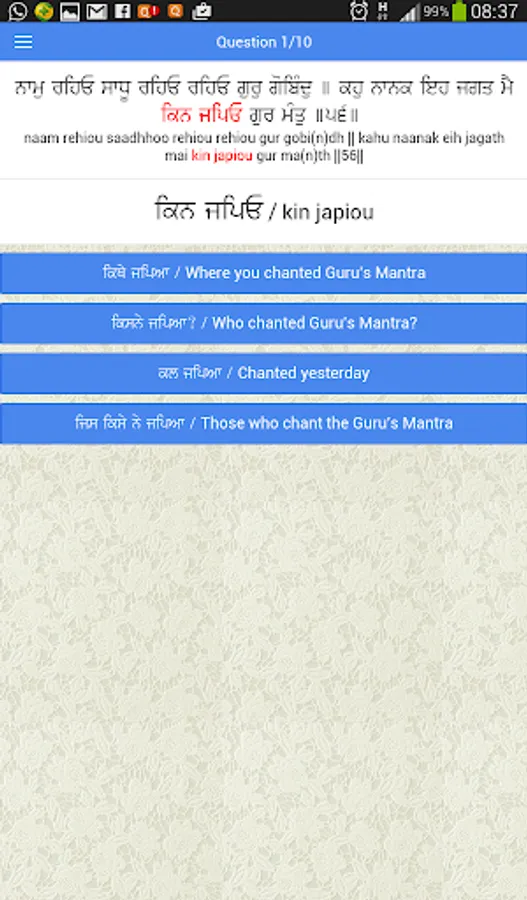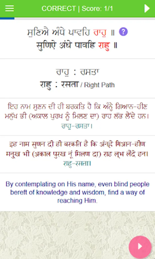 To make this more interesting, the app is designed as a quiz. It will display a Gurbani Tuk and ask you meaning of a word in the Tuk with 4 options to choose from. After every question, it explains the meaning of the word and the complete Gurbani Tuk in English and Punjabi. Every correct answer adds to your score. Each quiz asks 10 questions. At the end of each quiz, it shows all the questions asked in quiz along with their Punjabi, Hindi and English meanings for you to refer again to all the questions.
