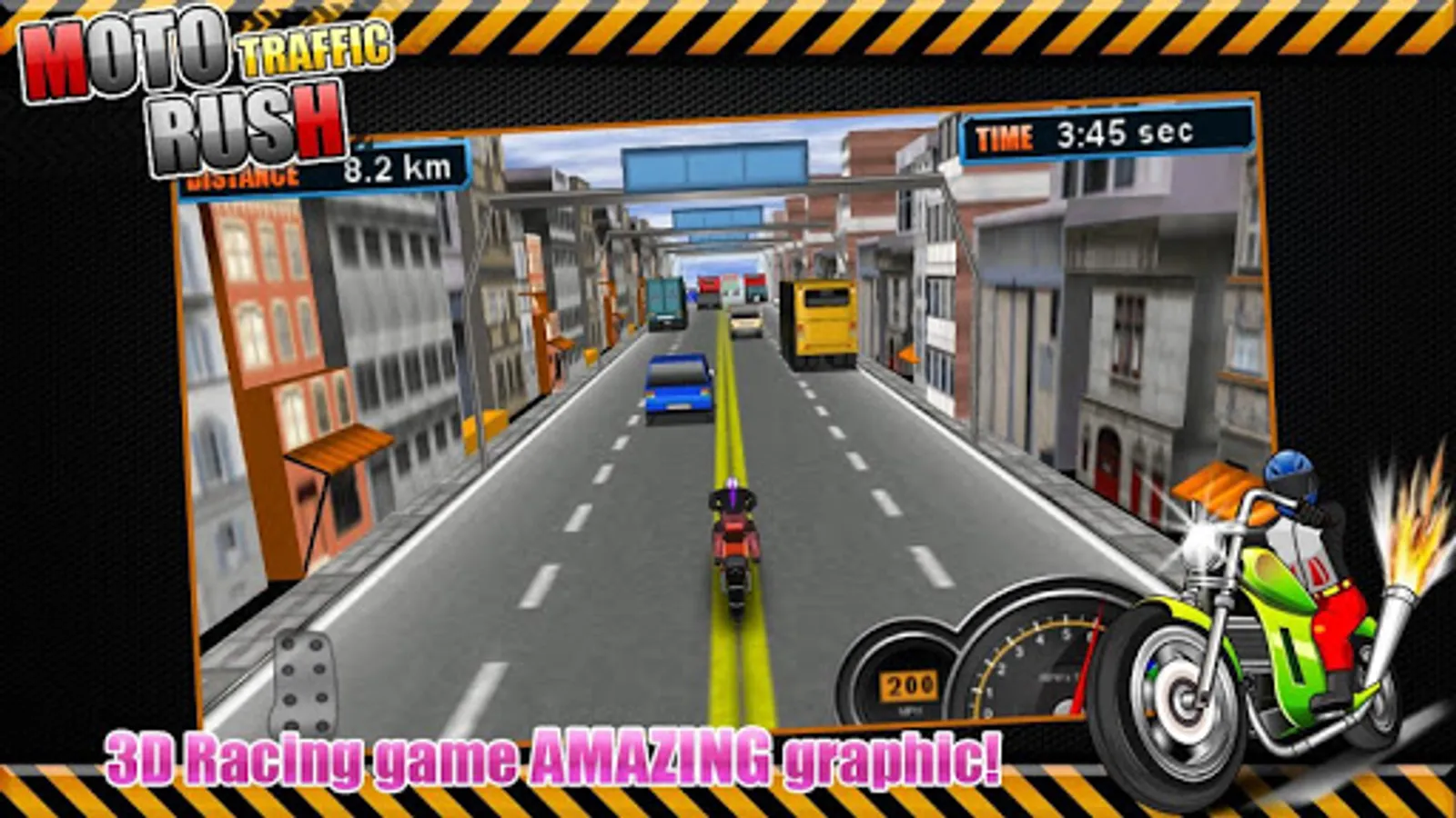 Moto Traffic Rush3D racing is the endless racing game to show your racing skills in the city streets, countryside roads,featuring amazing big traffic vehicles,an addictive gameplay and intense moto traffic racing challanges in game.