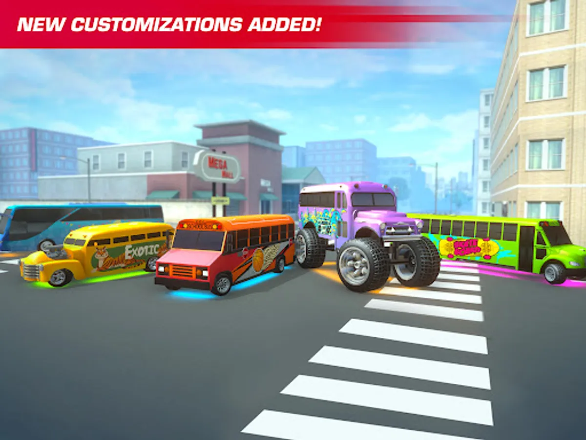 - Customize your School Buses, Sports Cars, SUVs, and Muscle cars with Decals, Spoilers, Rims, and Neons!