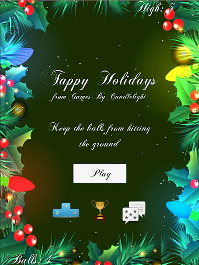 Compare your score with other players. Work on Achievements. Nice graphics and a holiday tune makes Tappy Holidays a fun little game to play around the holidays... or anytime!