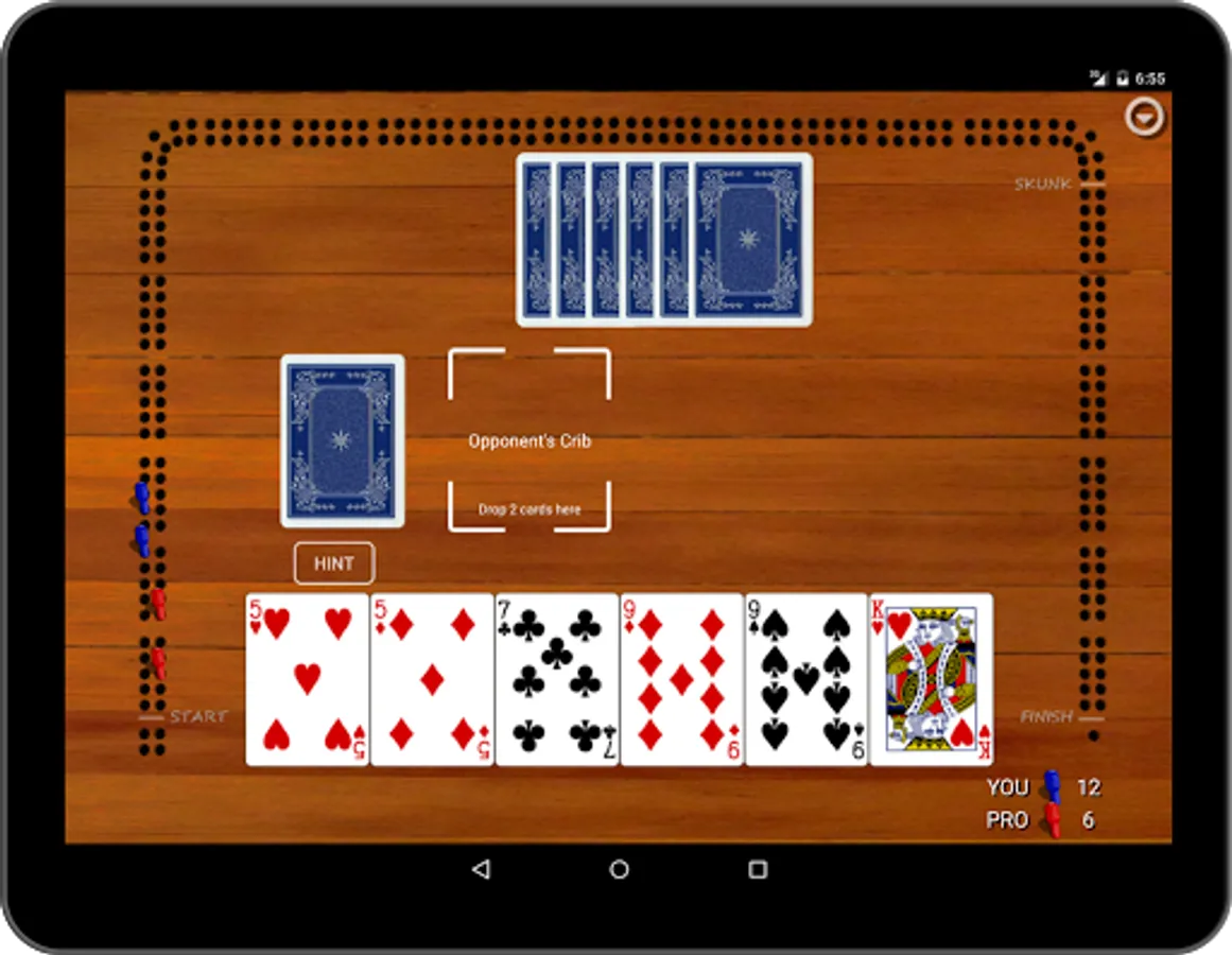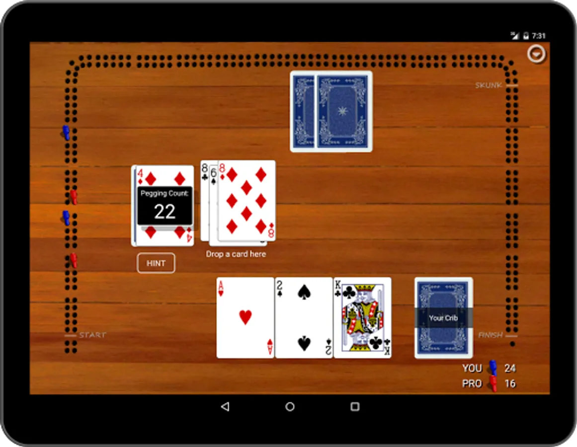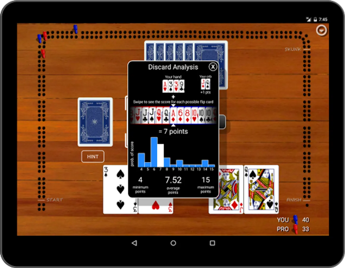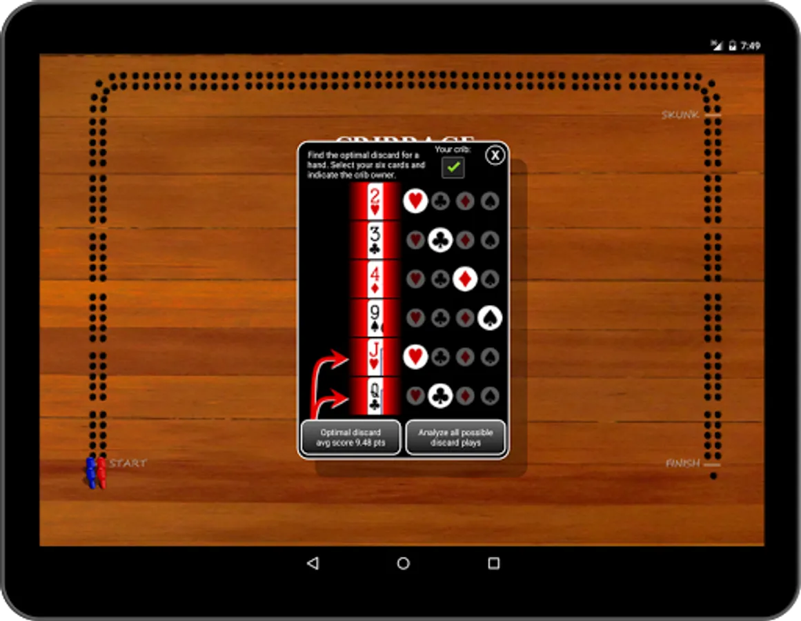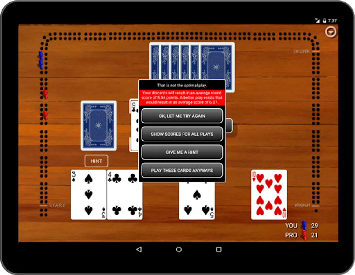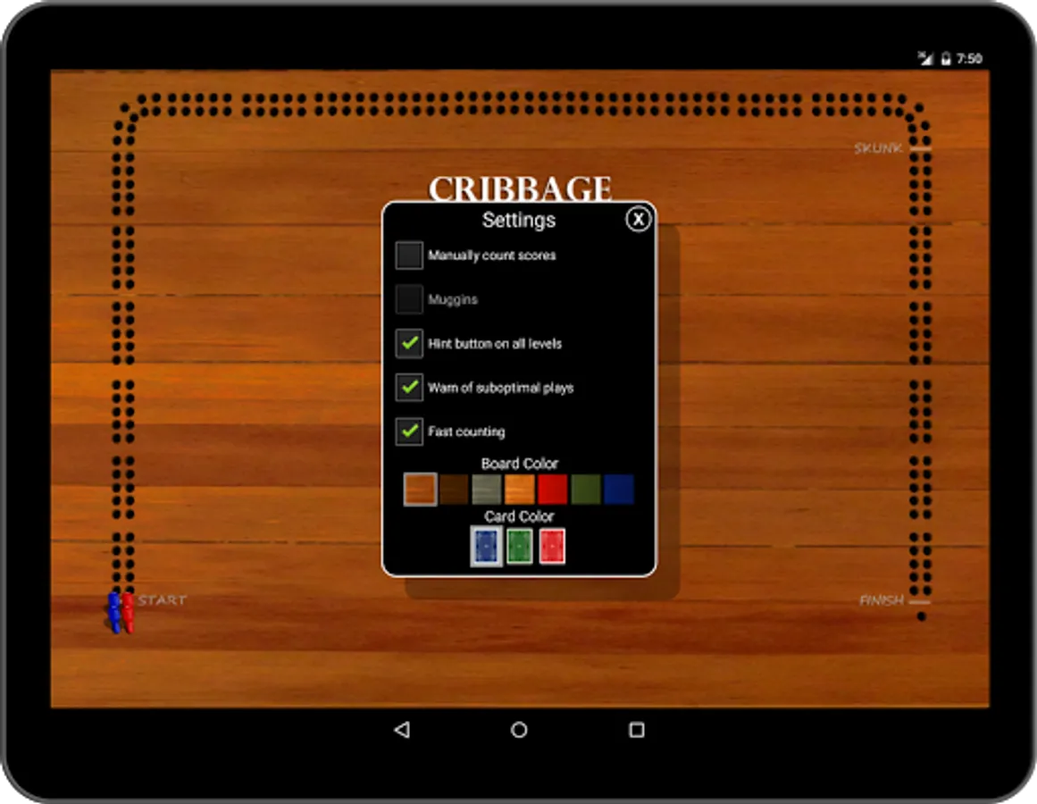 Cribbage Classic has a number of settings that can help you to learn the best move for your situation and offer assistance if it notices that you are making a sub-optimal play. Or just play in fast mode where all counting is done for you and you get to simply focus on discarding and pegging. By tweaking the settings you can take this app anywhere from a lazy-thoughtless-time-waster game to a skill-sharpening-master-tutorial helping you to crush your next opponent. Statistics are also kept so you can see your average pegging score, your average hand score, and your average crib score! Also shows you a summary of all of the sub-optimal plays you made at the end of the game and tracks your error rate over time so you can see yourself improving.