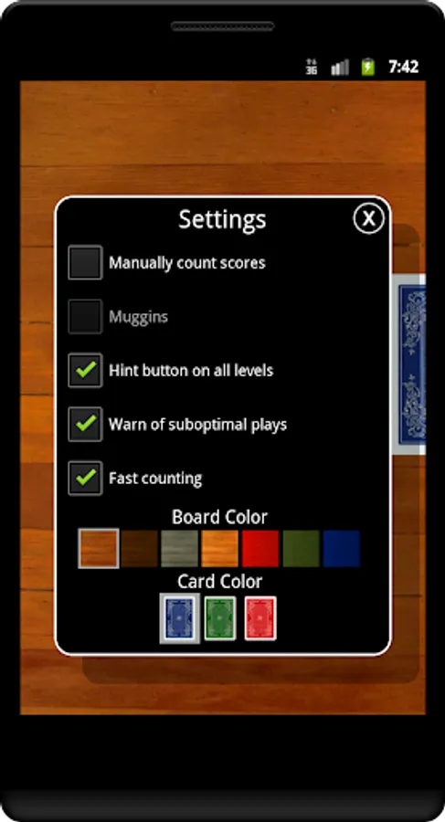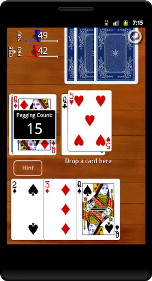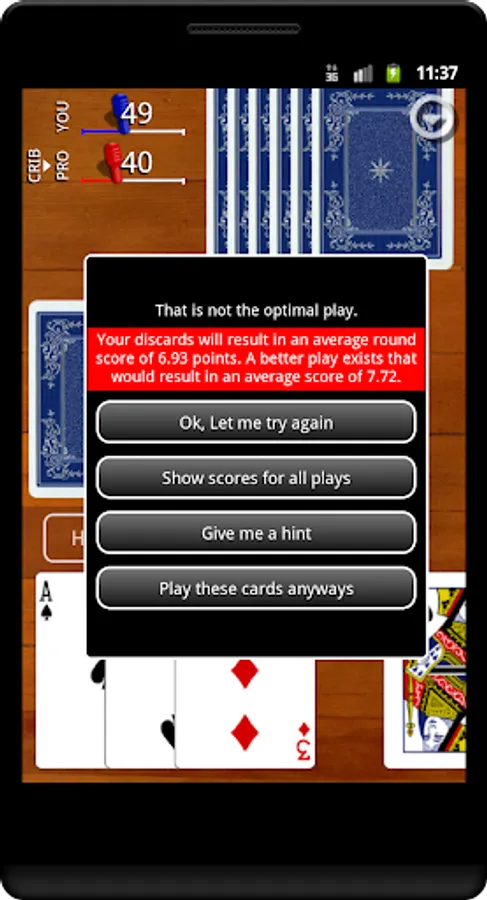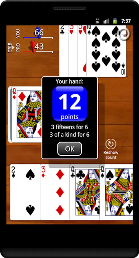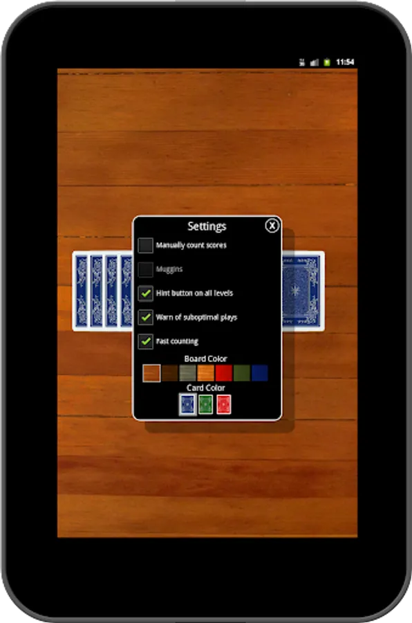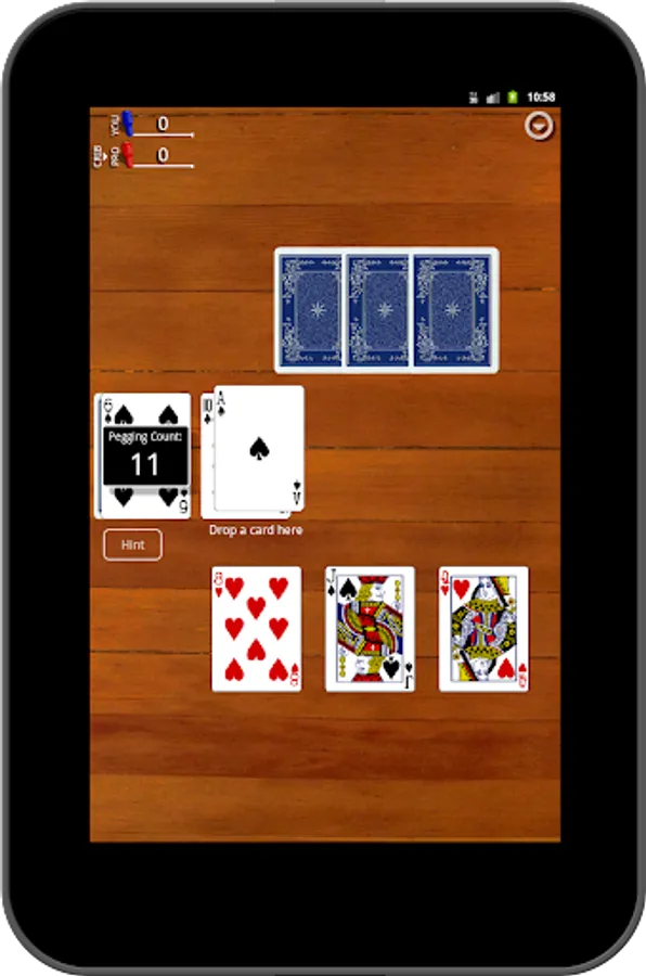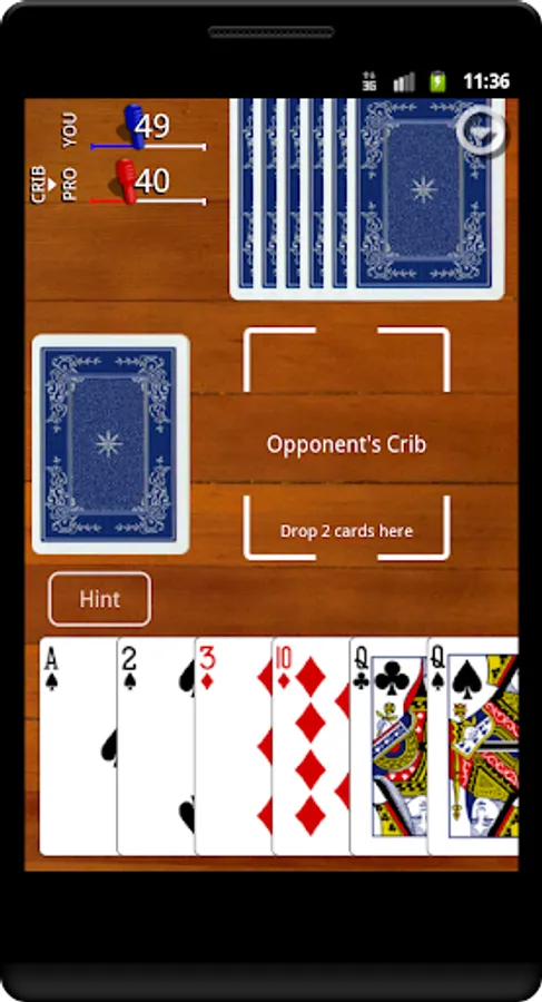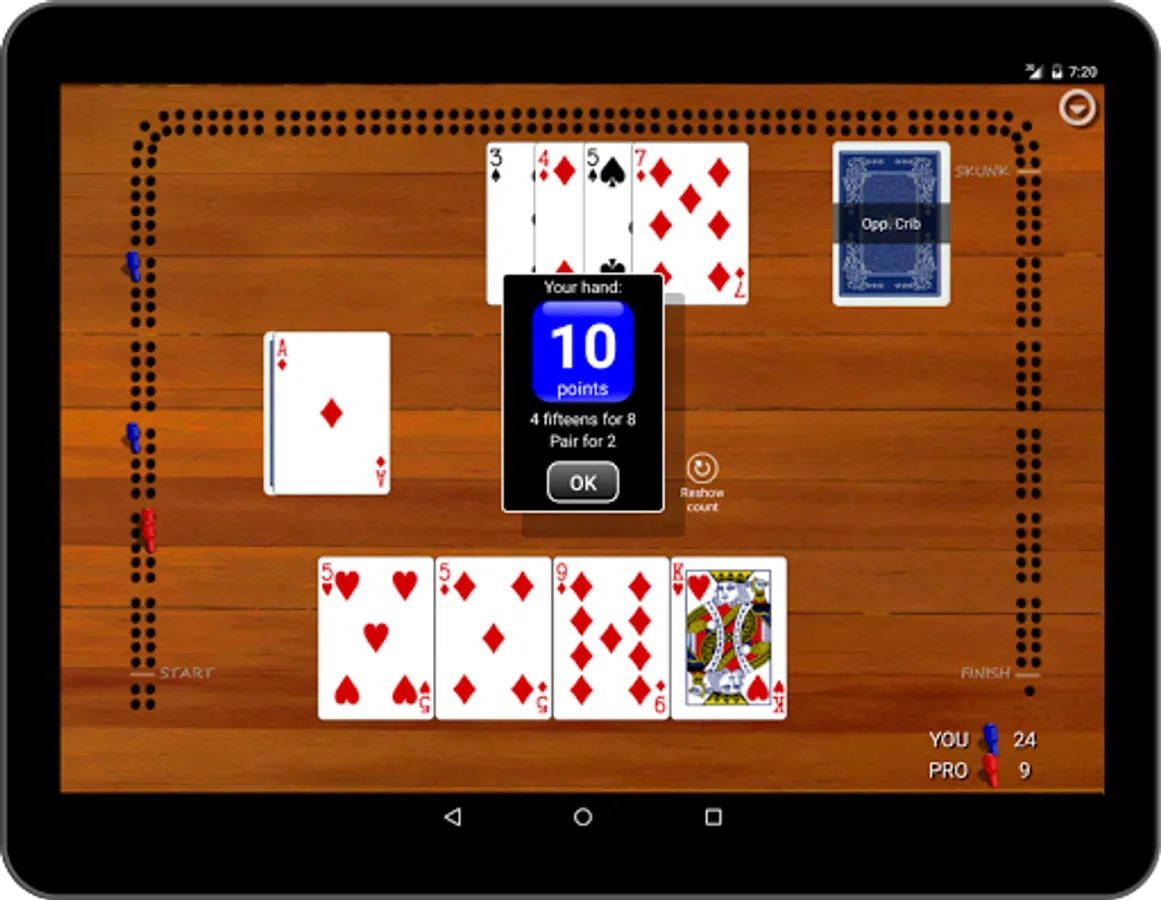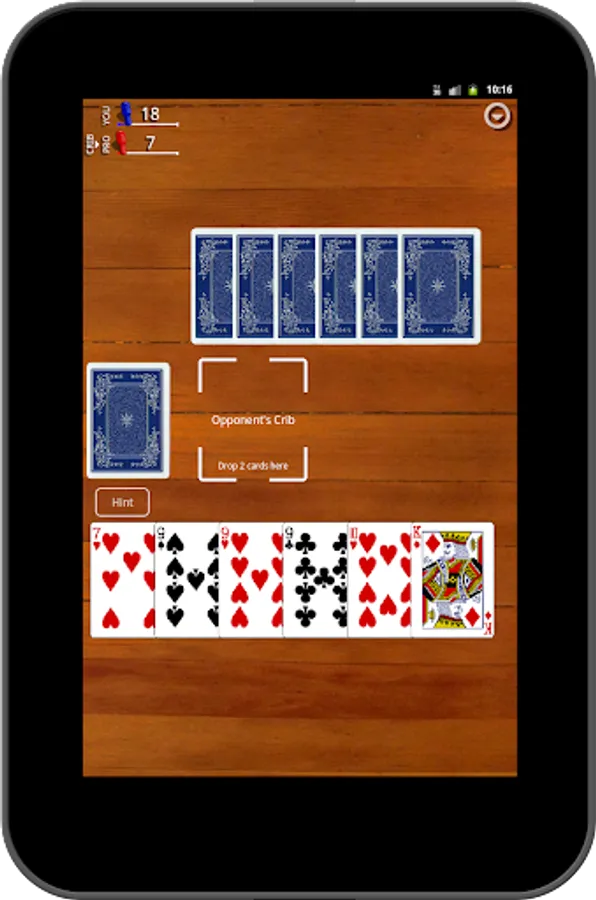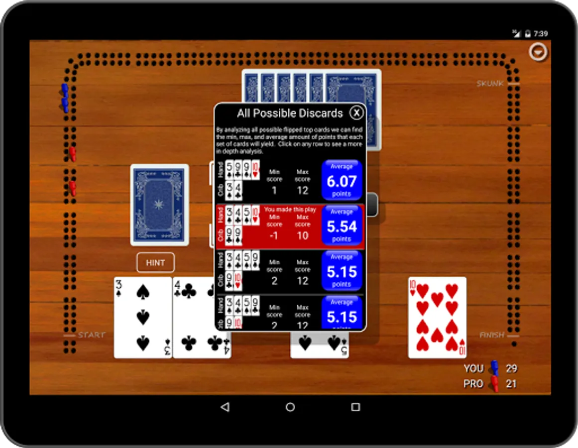 Cribbage Classic has a number of settings that can help you to learn the best move for your situation and offer assistance if it notices that you are making a sub-optimal play. Or just play in fast mode where all counting is done for you and you get to simply focus on discarding and pegging. By tweaking the settings you can take this app anywhere from a lazy-thoughtless-time-waster game to a skill-sharpening-master-tutorial helping you to crush your next opponent. Statistics are also kept so you can see your average pegging score, your average hand score, and your average crib score! Also shows you a summary of all of the sub-optimal plays you made at the end of the game and tracks your error rate over time so you can see yourself improving.